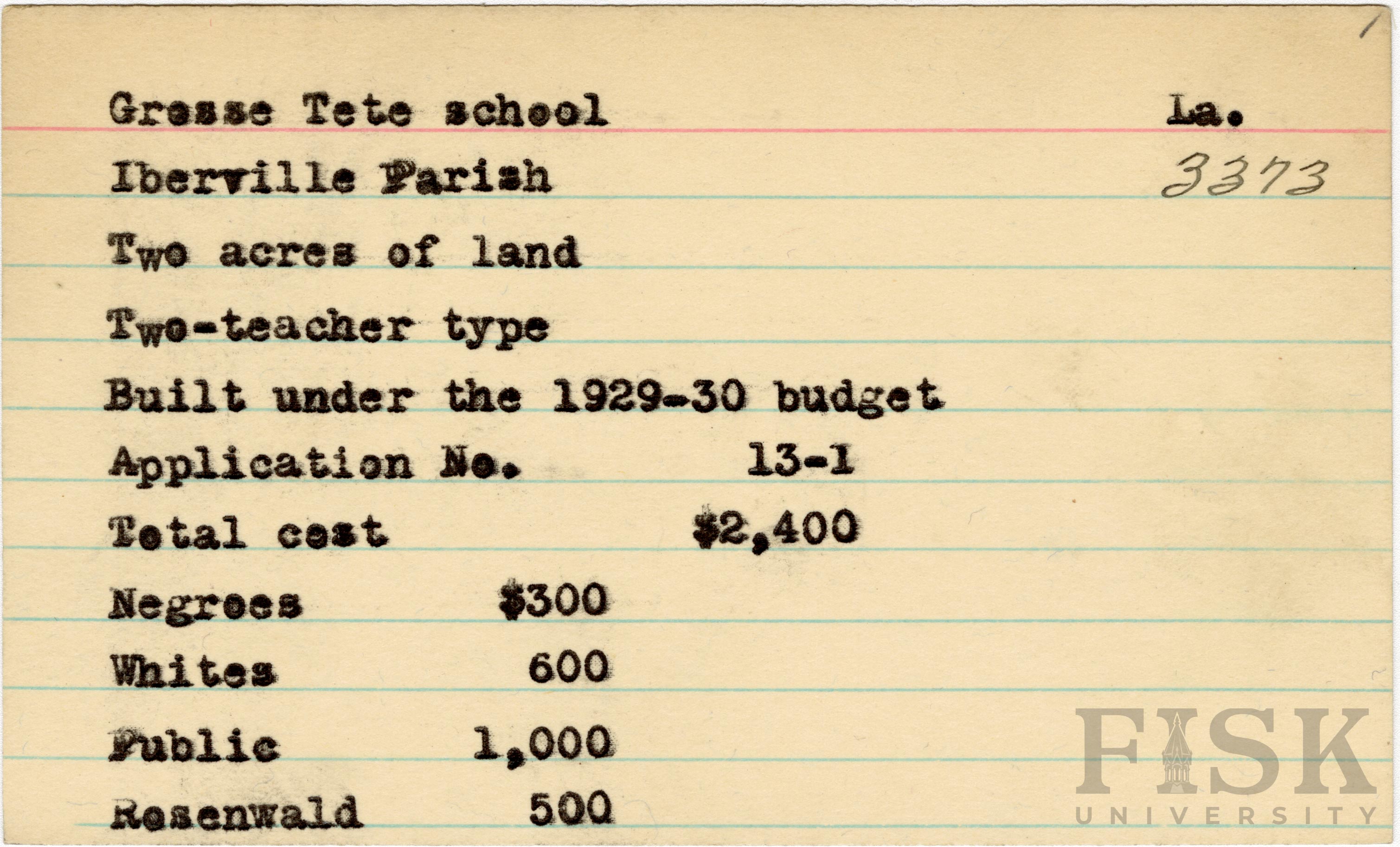 - School card from the Rosenwald Fund for Grosse Tete School in Iberville Parish, Louisiana