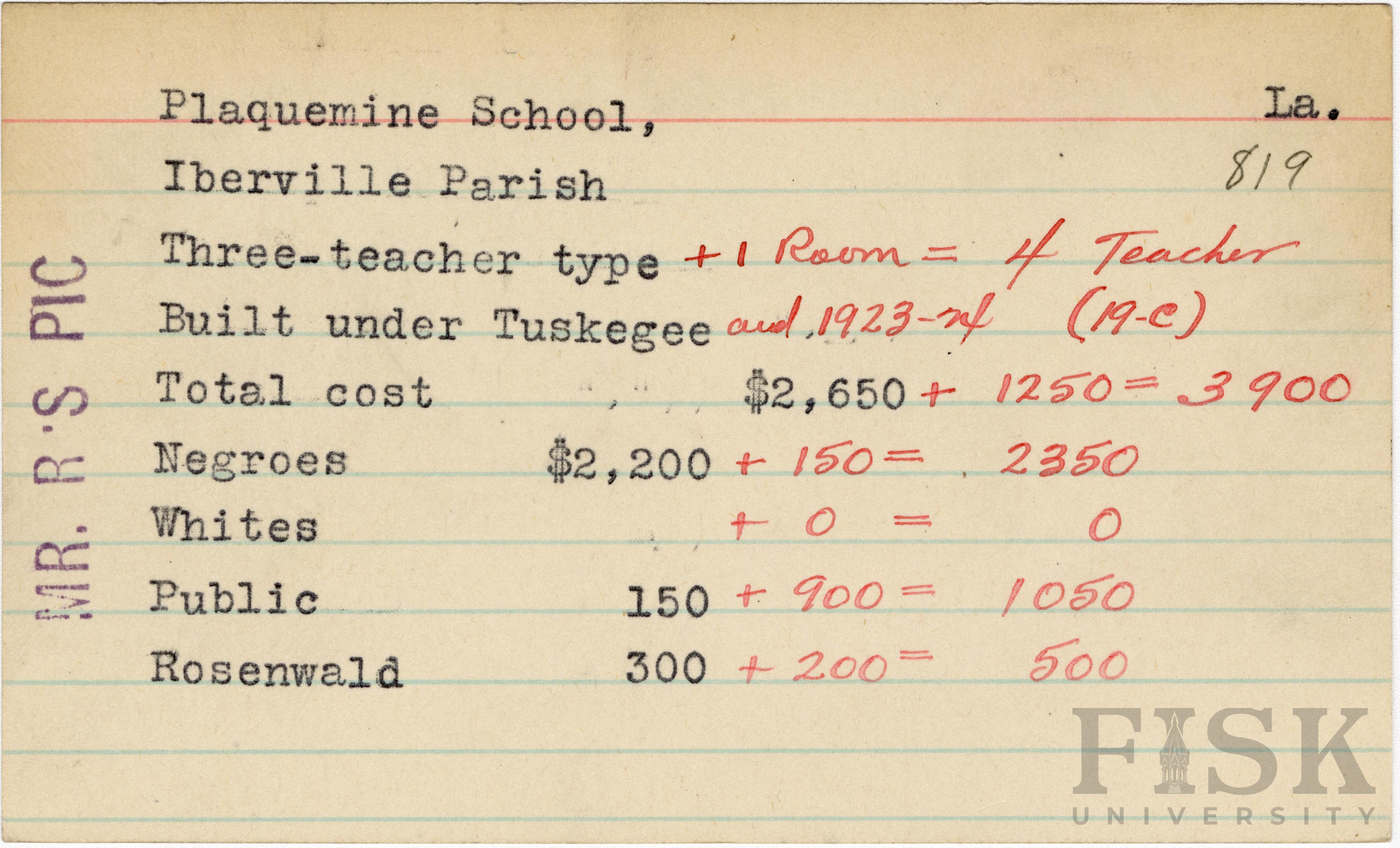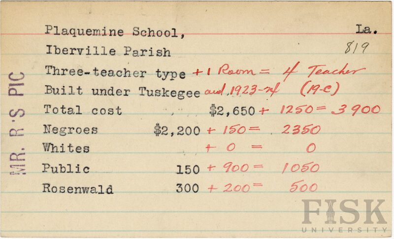 - School card from the Rosenwald Fund for Plaquemine School in Iberville Parish, Louisiana with handwritten additions to the teacher type, budget year, application number, and budget contribution sections. A note on the far left of the card says, "Mr. R's Pic".