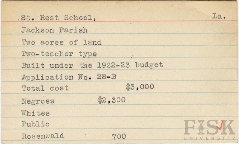 - School card from the Rosenwald Fund for St. Rest School in Jackson Parish, Louisiana