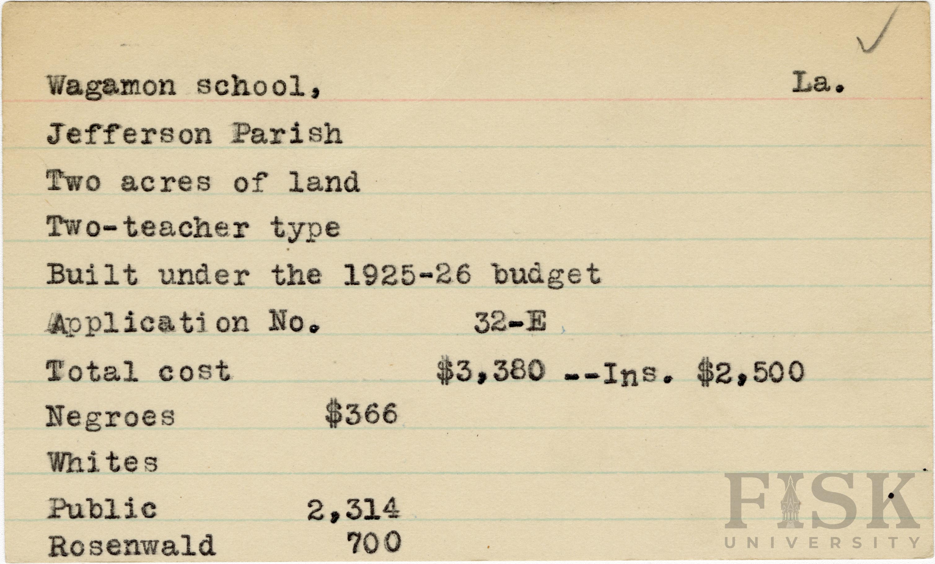 School card from the Rosenwald Fund for Wagamon School in Jefferson Parish, Louisiana with a section added to the budget contributions that says, "Ins. $2,500"