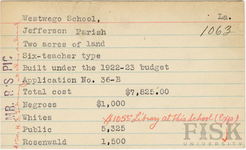 School card from the Rosenwald Fund for Westwego School in Jefferson Parish, Louisiana with notes on the card that say, "Mr. R's Pic," "$120 H.S. library at this school," and "$105.00 library at this school (Exp)"