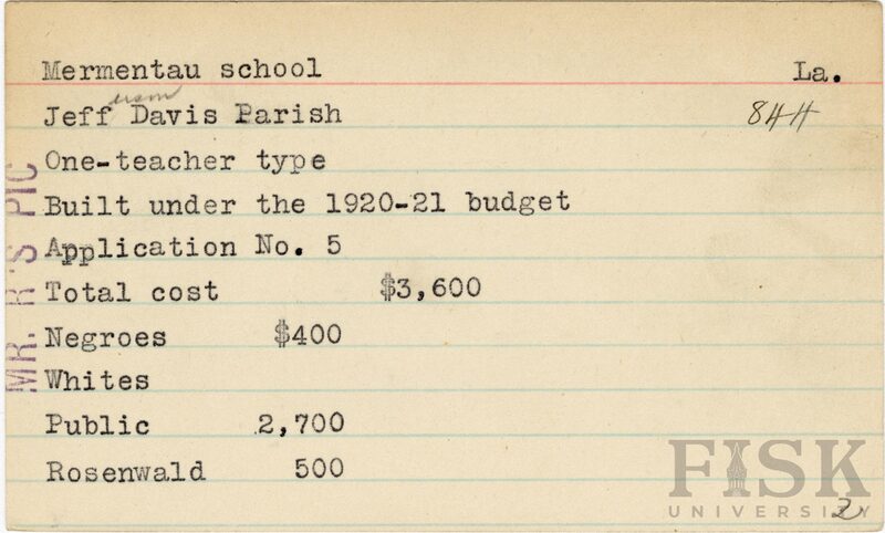 - School card from the Rosenwald Fund for Mermentau School in Jefferson Davis Parish, Louisiana with a note on the far left of the card that says, "Mr. R's Pic"