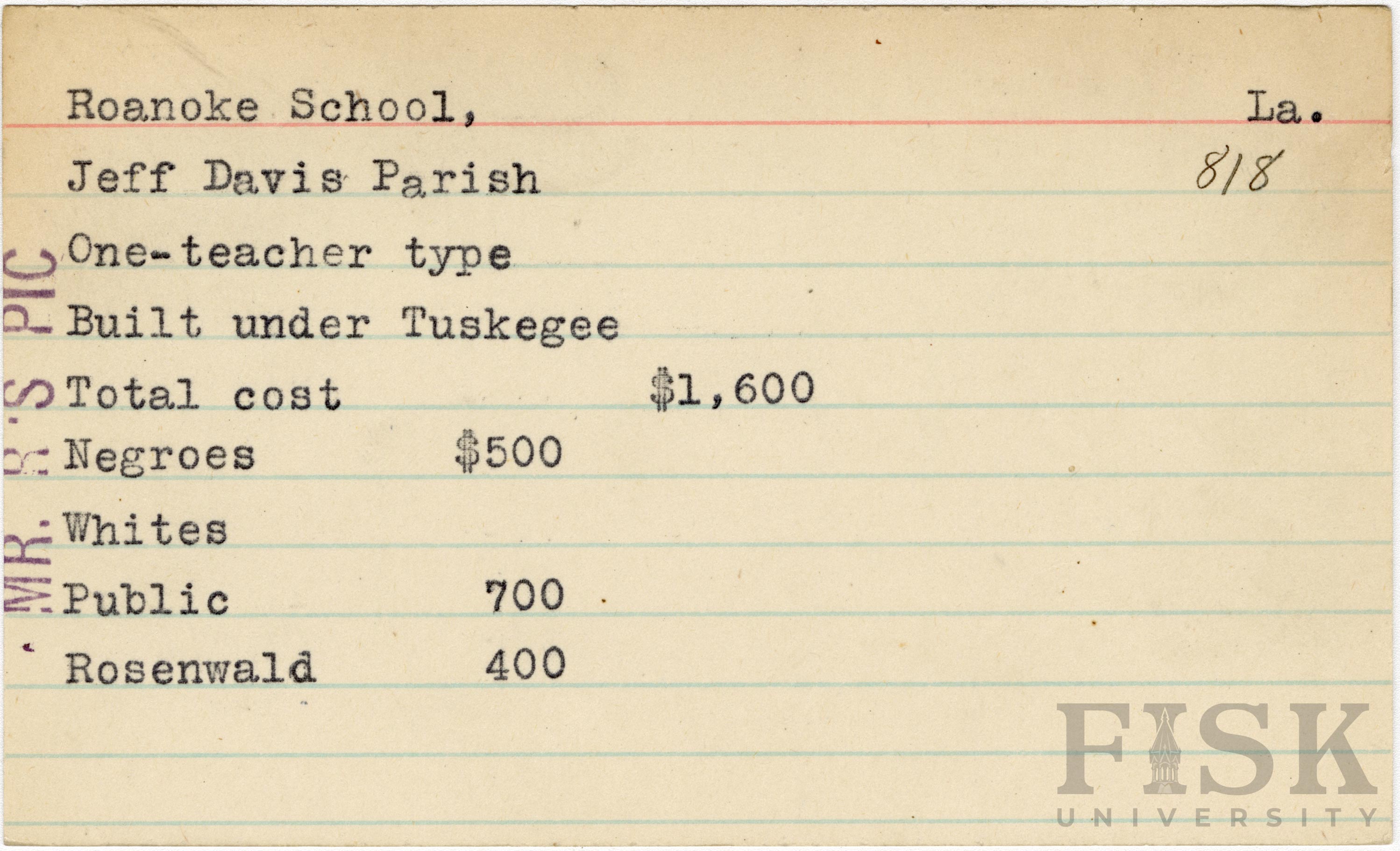 - School card from the Rosenwald Fund for Roanoke School in Jefferson Davis Parish, Louisiana with a note on the far left of the card that says, "Mr. R's Pic"