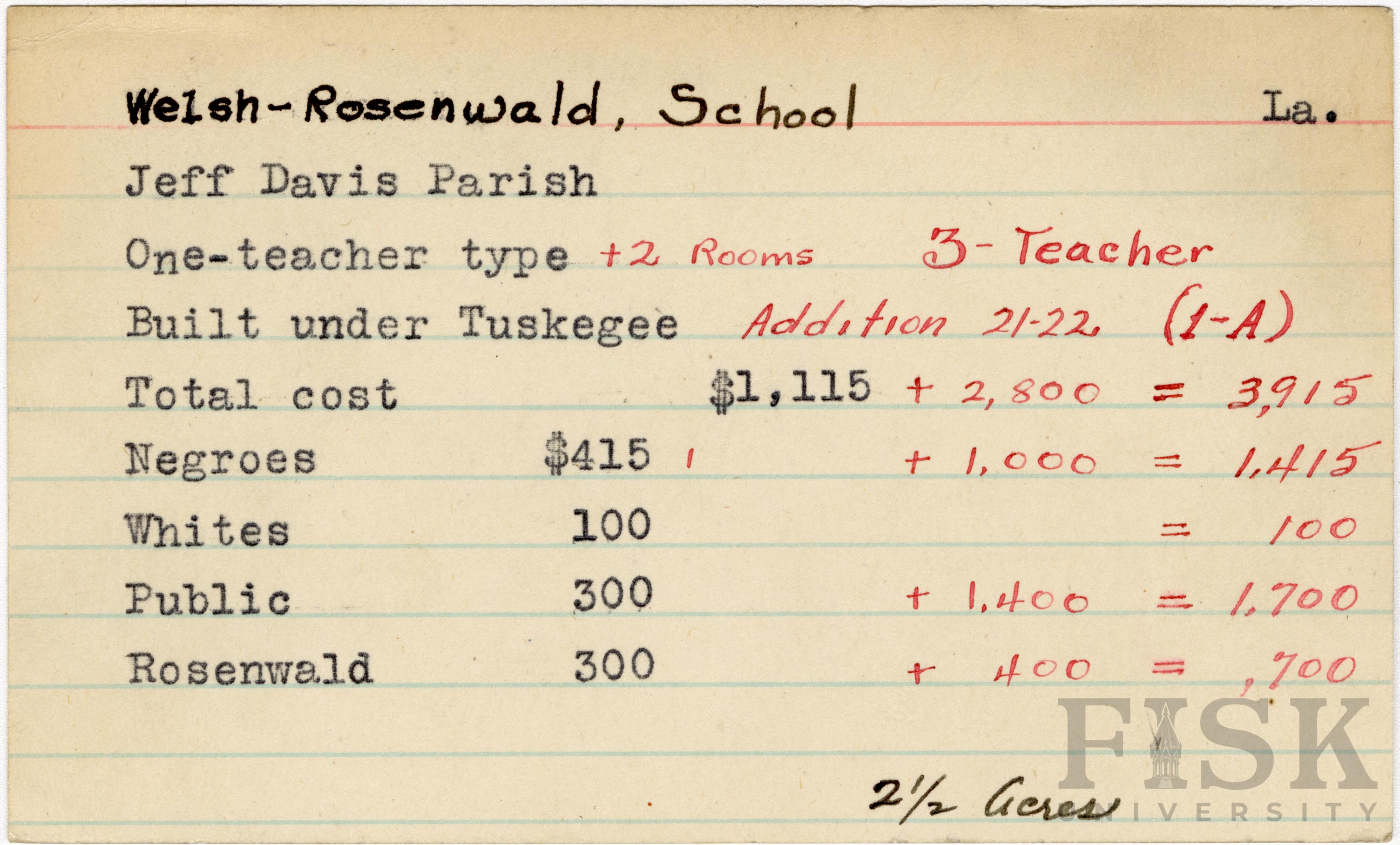 - School card from the Rosenwald Fund for Welsh-Rosenwald School in Jefferson Davis Parish, Louisiana with handwritten additions to the teacher type, budget year, application number, and budget contribution sections.