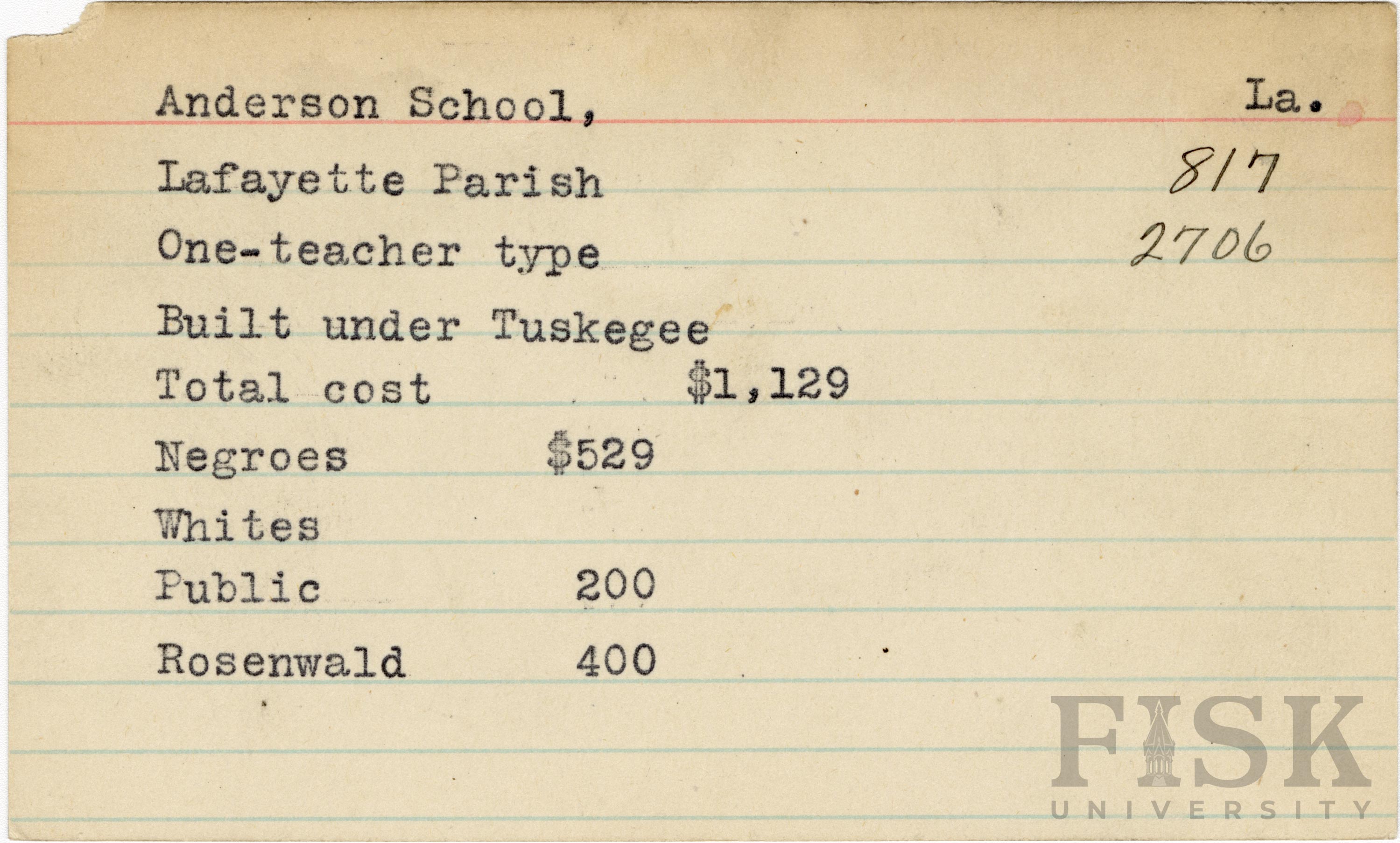 - School card from the Rosenwald Fund for Anderson School in Lafayette Parish, Louisiana