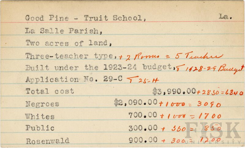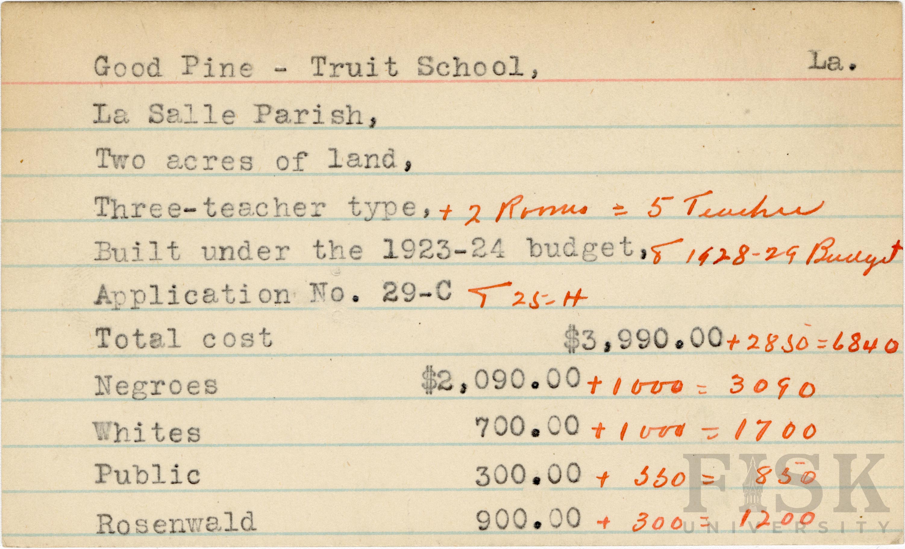 School card from the Rosenwald Fund for Good Pine-Truit School in La Salle Parish, Louisiana with handwritten additions to the teacher type, budget year, application number, and budget contribution sections.