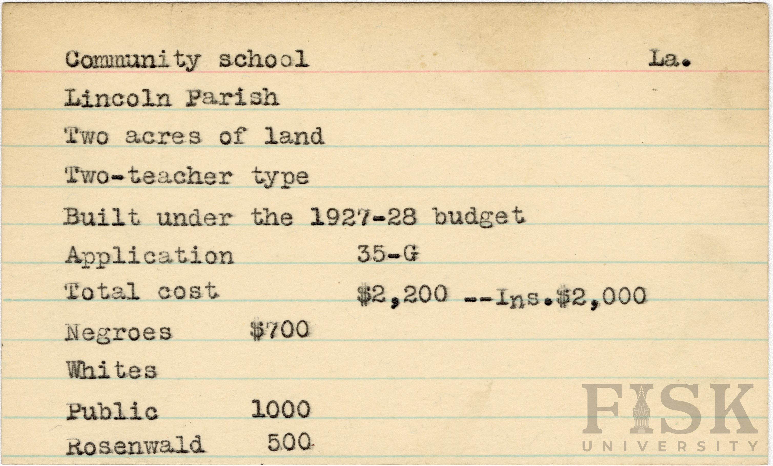 - School card from the Rosenwald Fund for Community School in Lincoln Parish, Louisiana with a section added to the budget contributions that says, "Ins. $2,000"