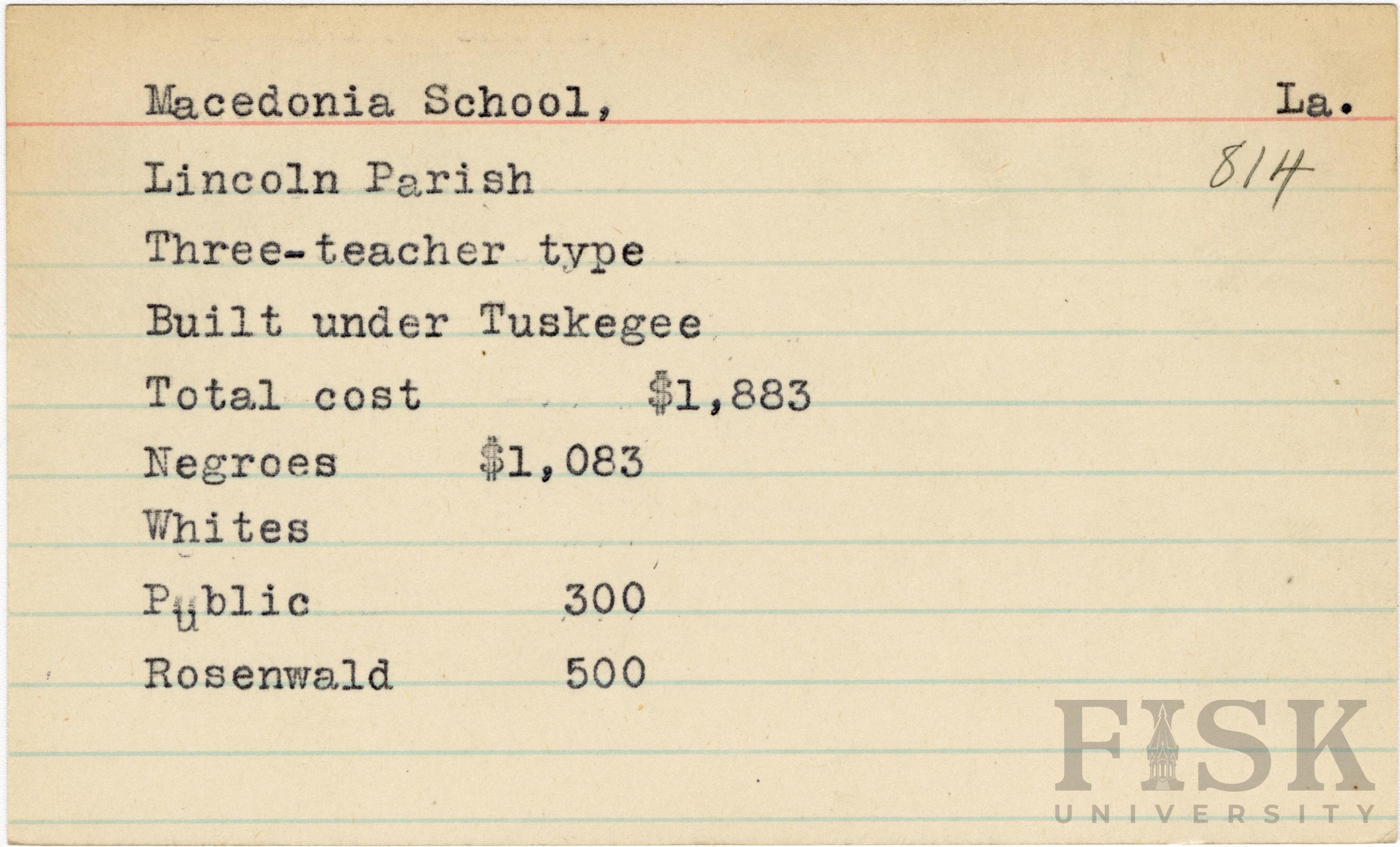 - School card from the Rosenwald Fund for Macedonia School in Lincoln Parish, Louisiana