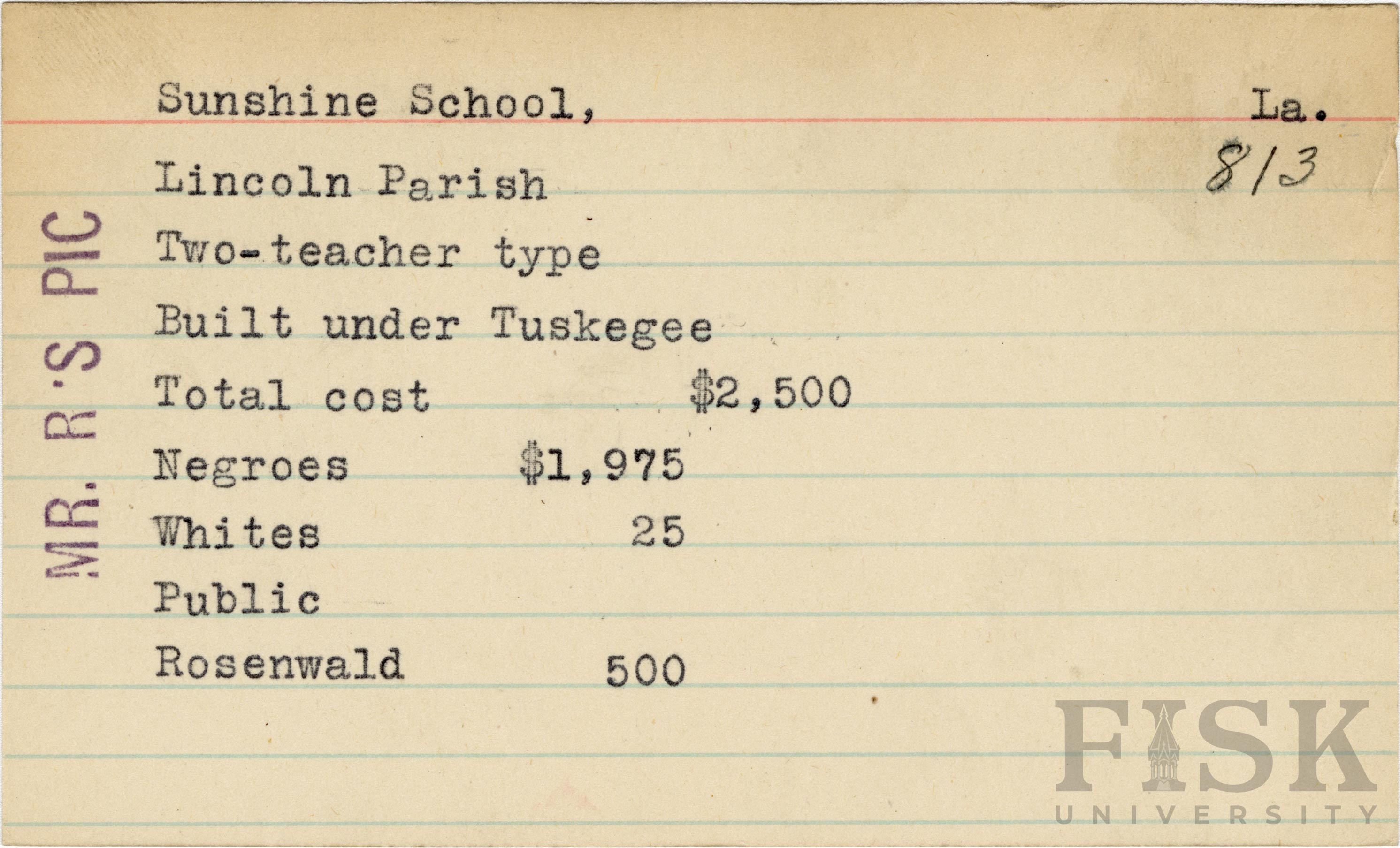 - School card from the Rosenwald Fund for Sunshine School in Lincoln Parish, Louisiana with a note on the far left of the card that says, "Mr. R's Pic"