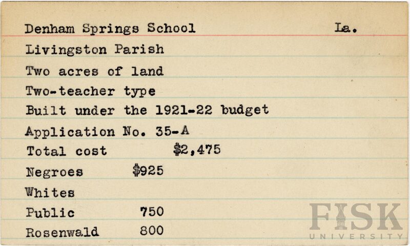 - School card from the Rosenwald Fund for Denham Springs School in Livingston Parish, Louisiana