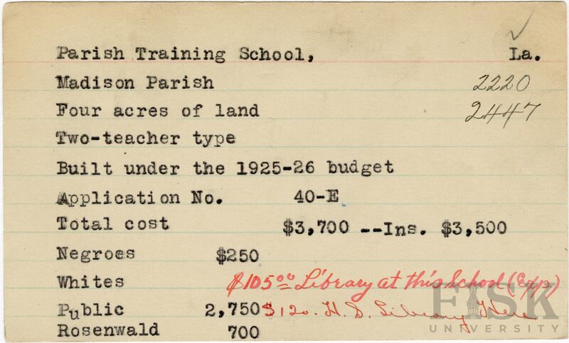 - School card from the Rosenwald Fund for Parish Training School in Madison Parish, Louisiana with a section added to the budget contributions that says, "Ins. $3,500". Handwritten additions on the card say, "$105.00 library at this school (Exp)" and "$120 H.S. library here"