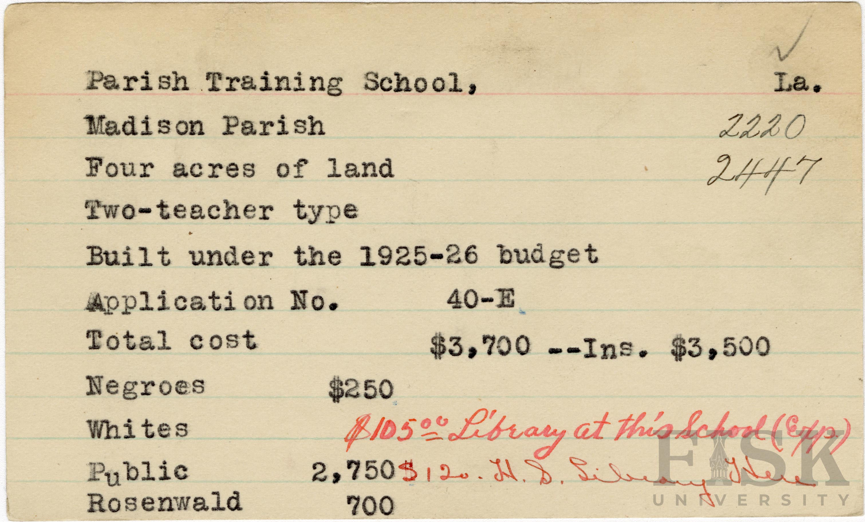 School card from the Rosenwald Fund for Parish Training School in Madison Parish, Louisiana with a section added to the budget contributions that says, "Ins. $3,500". Handwritten additions on the card say, "$105.00 library at this school (Exp)" and "$120 H.S. library here"