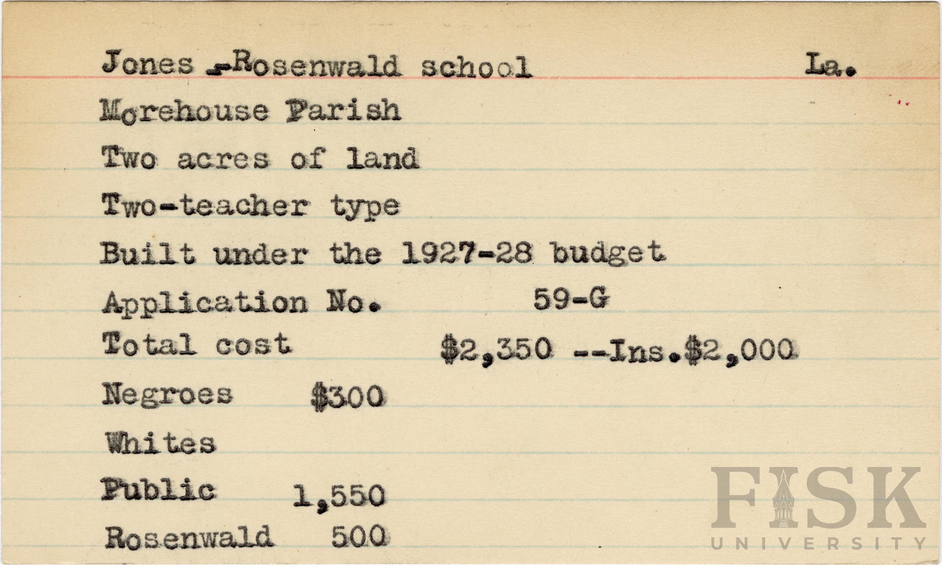 School card from the Rosenwald Fund for Jones-Rosenwald School in Morehouse Parish, Louisiana with a section added to the budget contributions that says, "Ins. $2,000"