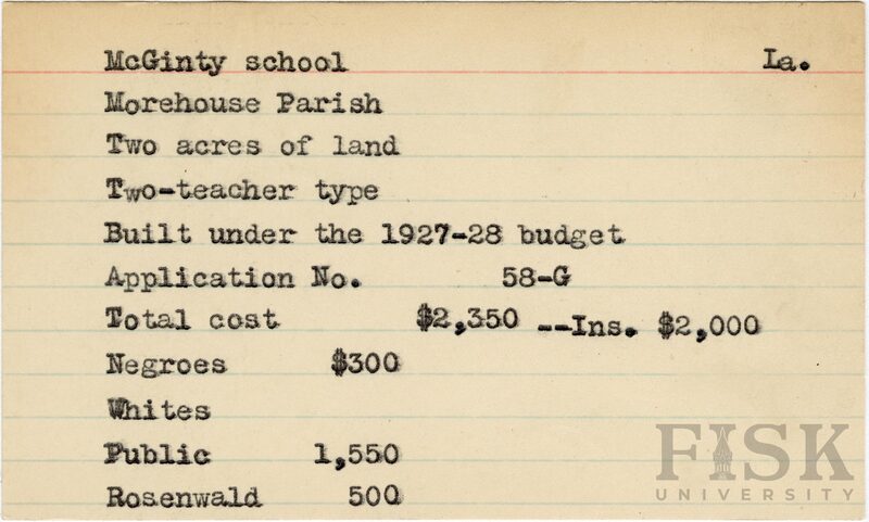 - School card from the Rosenwald Fund for McGinty School in Morehouse Parish, Louisiana with a section added to the budget contributions that says, "Ins. $2,000"
