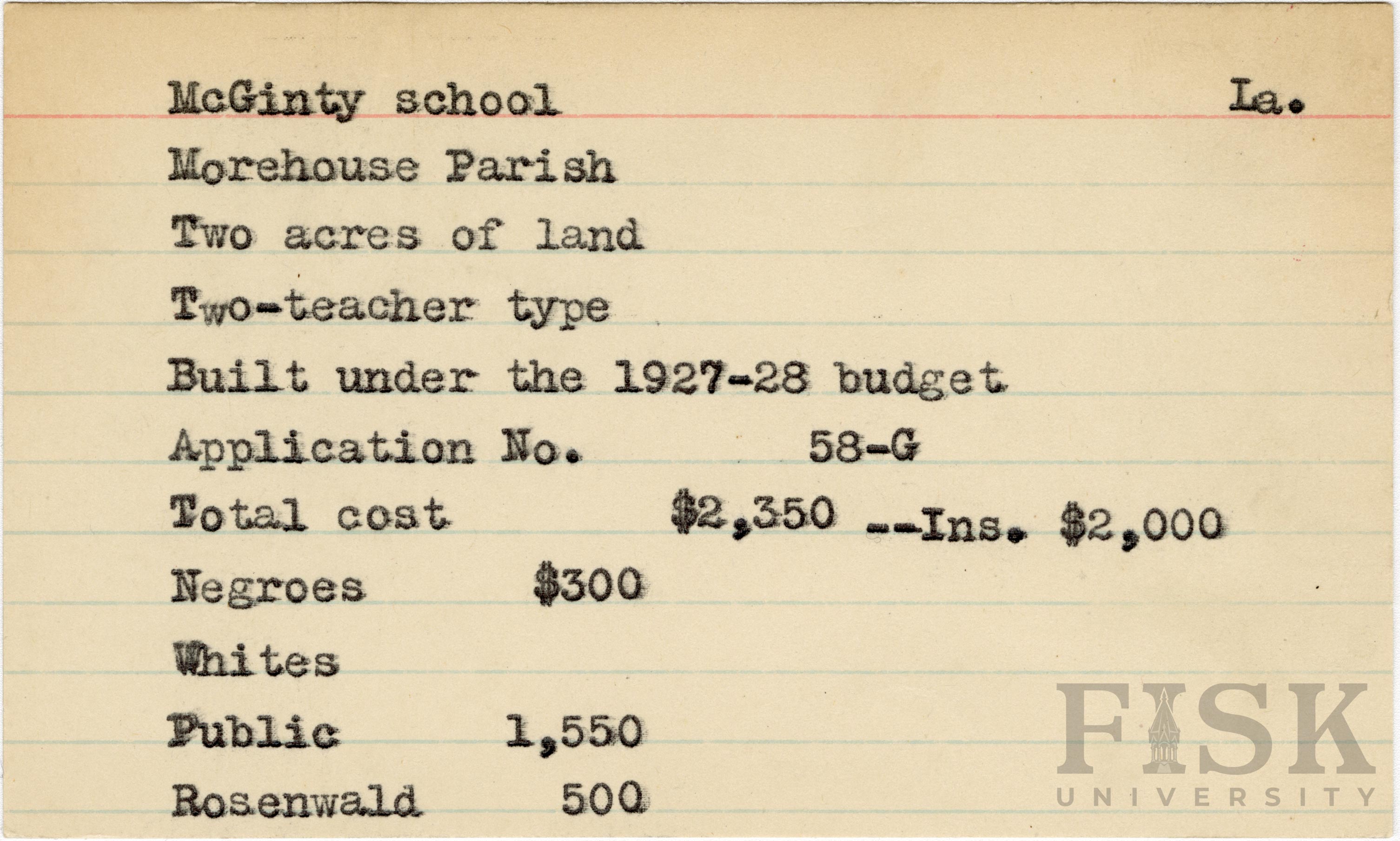 School card from the Rosenwald Fund for McGinty School in Morehouse Parish, Louisiana with a section added to the budget contributions that says, "Ins. $2,000"