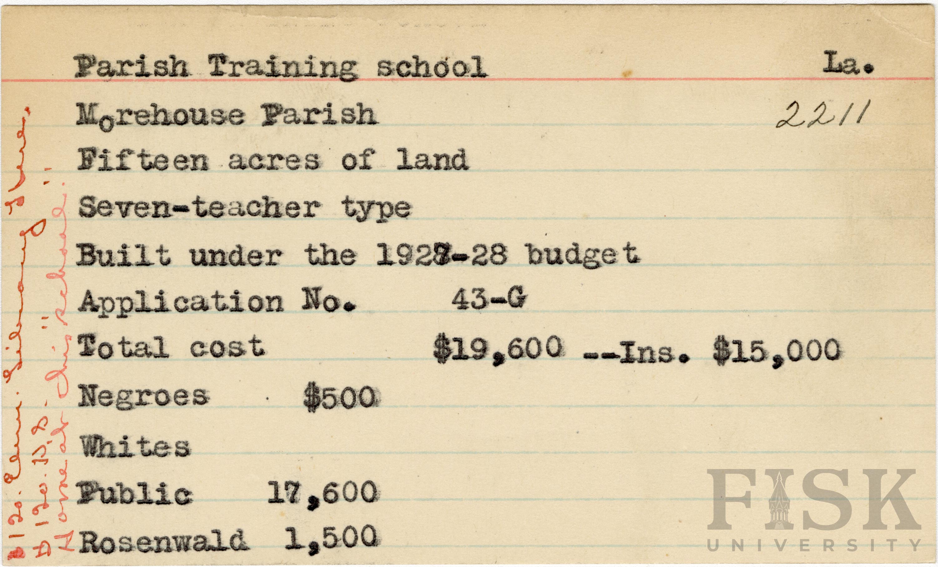 - School card from the Rosenwald Fund for Parish Training School in Morehouse Parish, Louisiana with a section added to the budget contributions that says, "Ins. $15,000". Handwritten notes on the far left of the card say, "$120 elem library here," "$120 H.S. library here," and "home at this school."