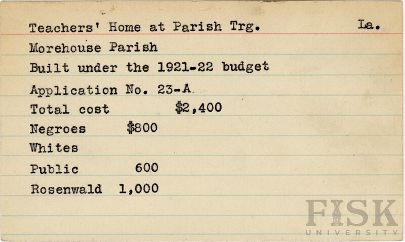 School card from the Rosenwald Fund for the teacher's home at Parish Training School in Morehouse Parish, Louisiana