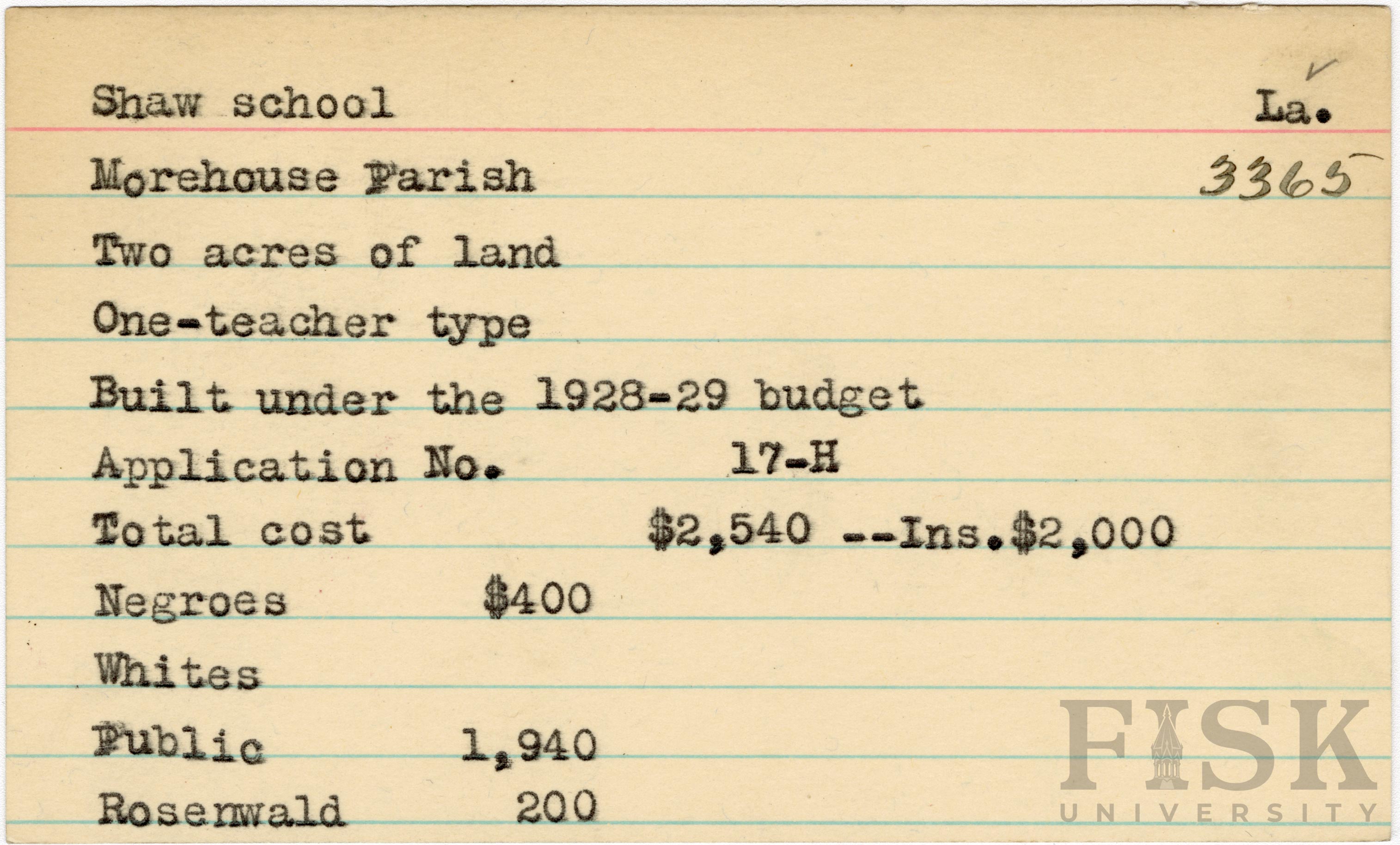 School card from the Rosenwald Fund for Shaw School in Morehouse Parish, Louisiana with a section added to the budget contributions that says, "Ins. $2,000"