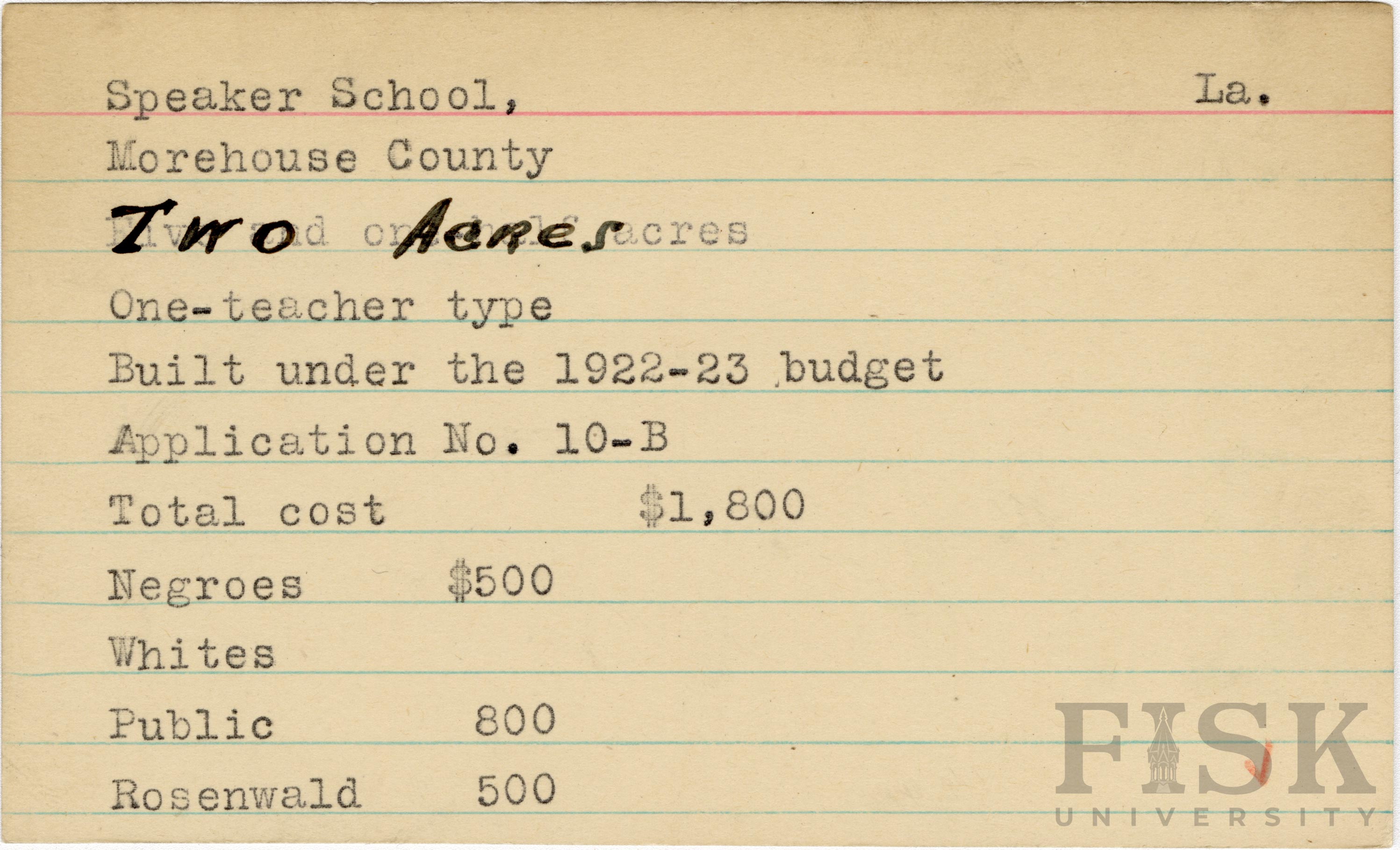 - School card from the Rosenwald Fund for Speaker School in Morehouse Parish, Louisiana