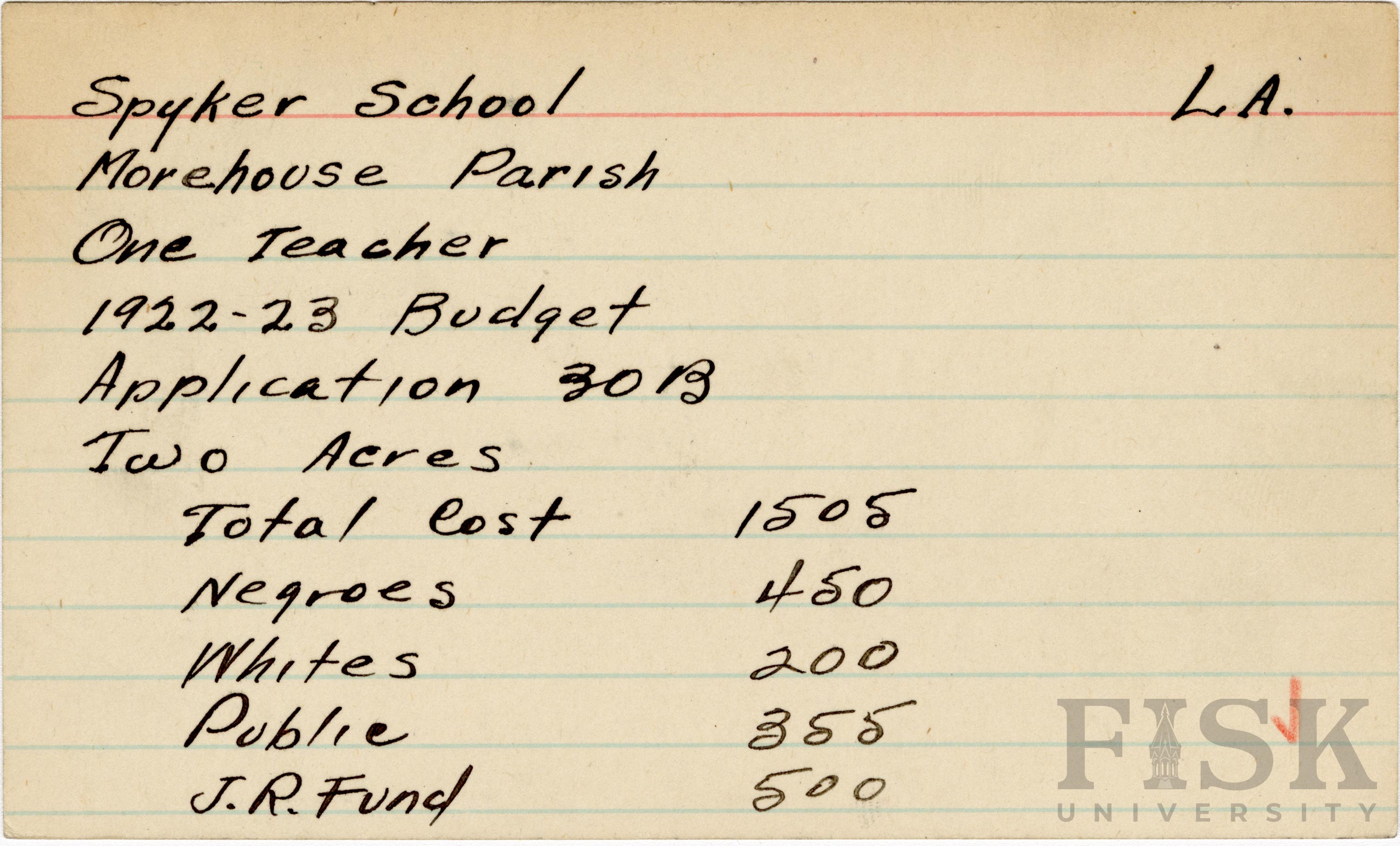 - School card from the Rosenwald Fund for Spyker School in Morehouse Parish, Louisiana. The whole card is handwritten.