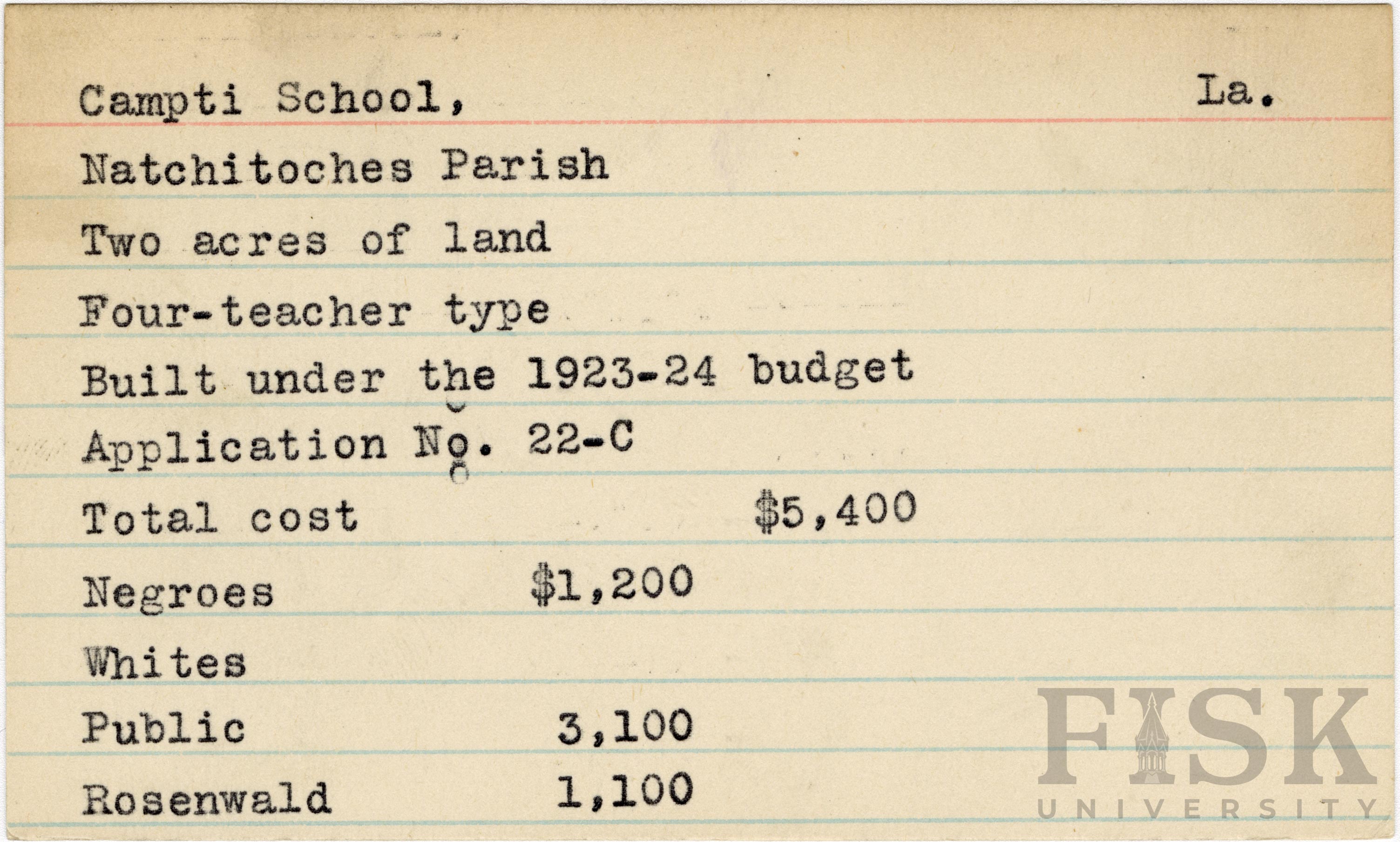 - School card from the Rosenwald Fund for Campti School in Natchitoches Parish, Louisiana