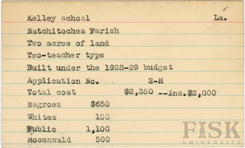 - School card from the Rosenwald Fund for Kelley School in Natchitoches Parish, Louisiana with a section added to the budget contributions that says, "Ins. $2,000"