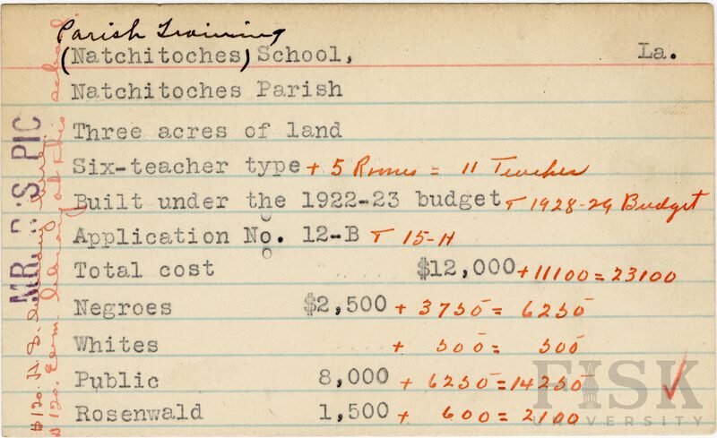 - School card from the Rosenwald Fund for Natchitoches School in Natchitoches Parish, Louisiana with handwritten additions to the teacher type, budget year, application number, and budget contribution sections. Notes on the far left of the card say, "Mr. R's Pic," $120 H.S. library here," and "$120 elem library at this school"