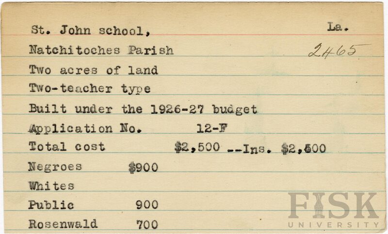 School card from the Rosenwald Fund for St. John School in Natchitoches Parish, Louisiana with a section added to the budget contributions that says, "Ins. $2,500"
