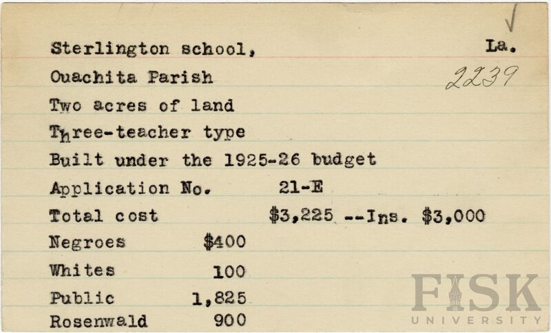 School card from the Rosenwald Fund for Sterlington School in Ouachita Parish, Louisiana with a section added to the budget contributions that says, "Ins. $3,000"