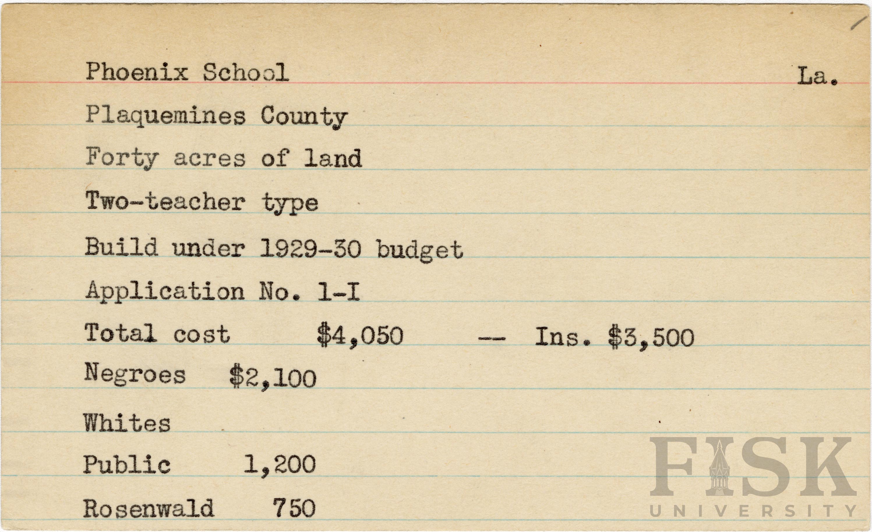 - School card from the Rosenwald Fund for Phoenix School in Plaquemines Parish, Louisiana with a section added to the budget contributions that says, "Ins. $3,500"