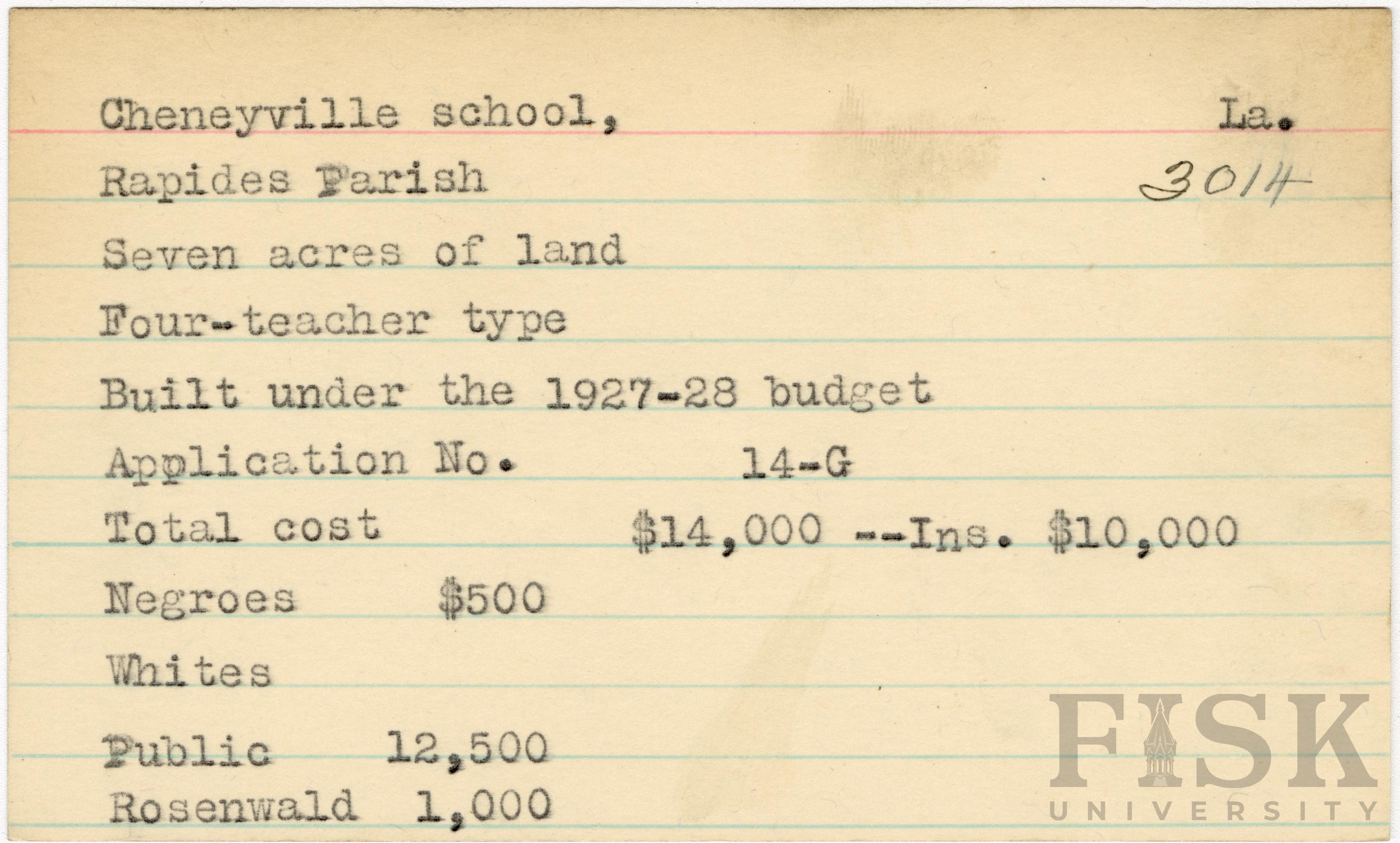 - School card from the Rosenwald Fund for Cheneyville School in Rapides Parish, Louisiana with a section added to the budget contributions that says, "Ins. $10,000"