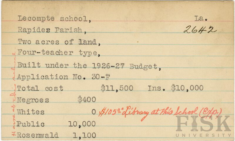 - School card from the Rosenwald Fund for Lecompte School in Rapides Parish, Louisiana with a section added to the budget contributions that says, "Ins. $10,000". Handwritten notes on the card say, "home at this school" and "$105.00 library at this school (Exp)"