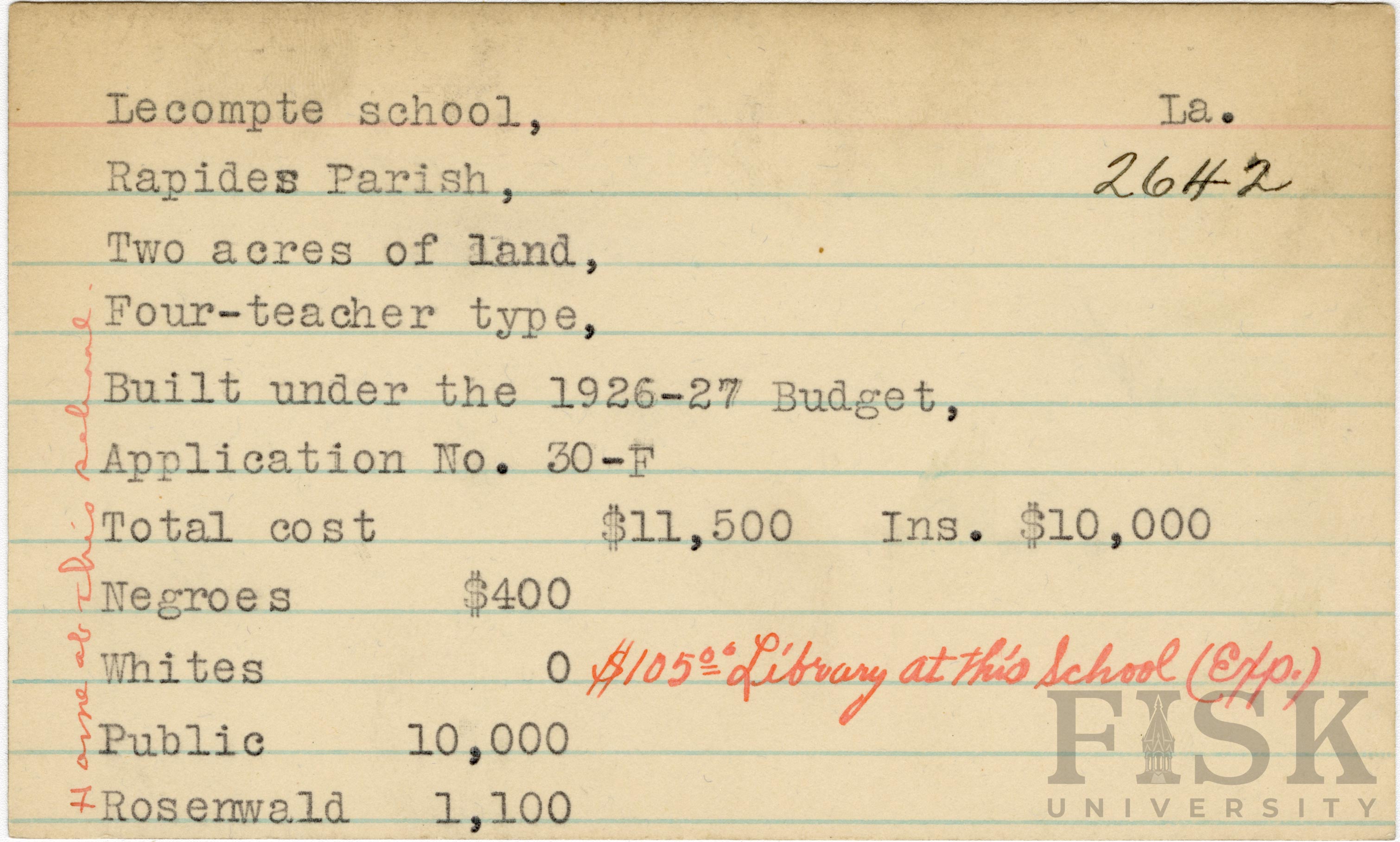 School card from the Rosenwald Fund for Lecompte School in Rapides Parish, Louisiana with a section added to the budget contributions that says, "Ins. $10,000". Handwritten notes on the card say, "home at this school" and "$105.00 library at this school (Exp)"