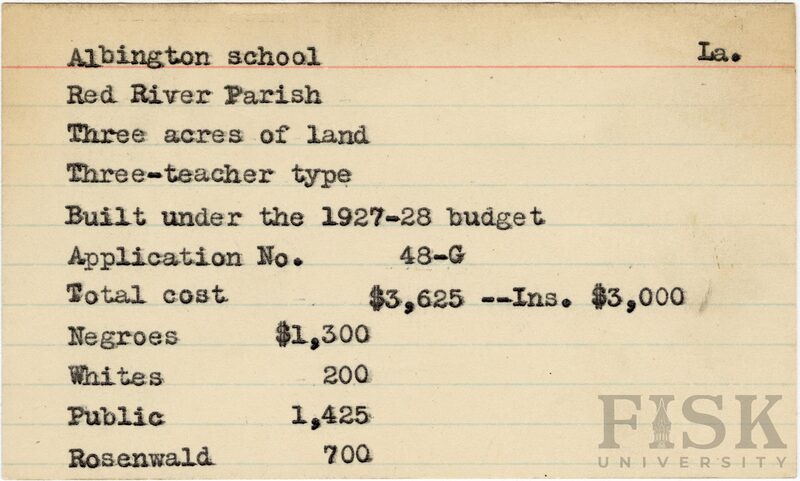School card from the Rosenwald Fund for Albington School in Red River Parish, Louisiana with a section added to the budget contributions that says, "Ins. $3,000"