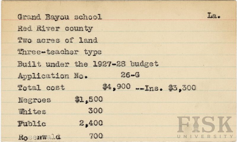 - School card from the Rosenwald Fund for Grand Bayou School in Red River Parish, Louisiana with a section added to the budget contributions that says, "Ins. $3,300"
