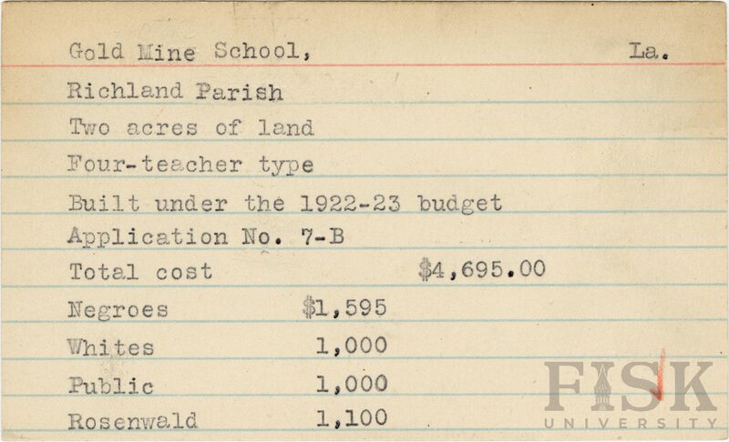 - School card from the Rosenwald Fund for Gold Mine School in Richland Parish, Louisiana