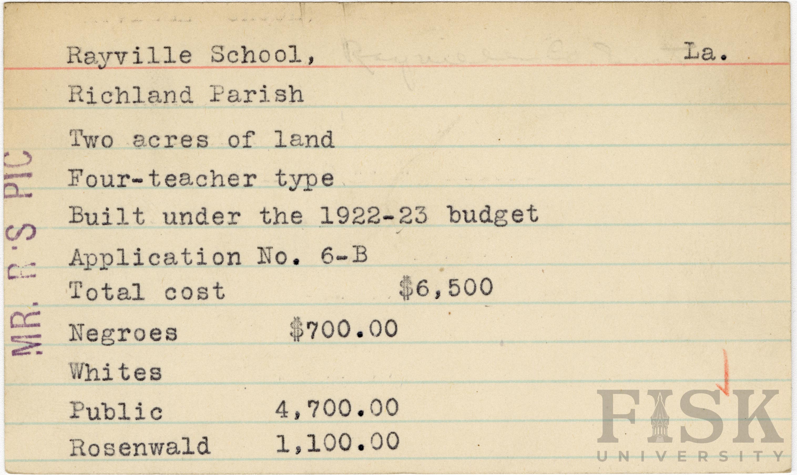 School card from the Rosenwald Fund for Rayville School in Richland Parish, Louisiana with a note on the far left of the card that says, "Mr. R's Pic"
