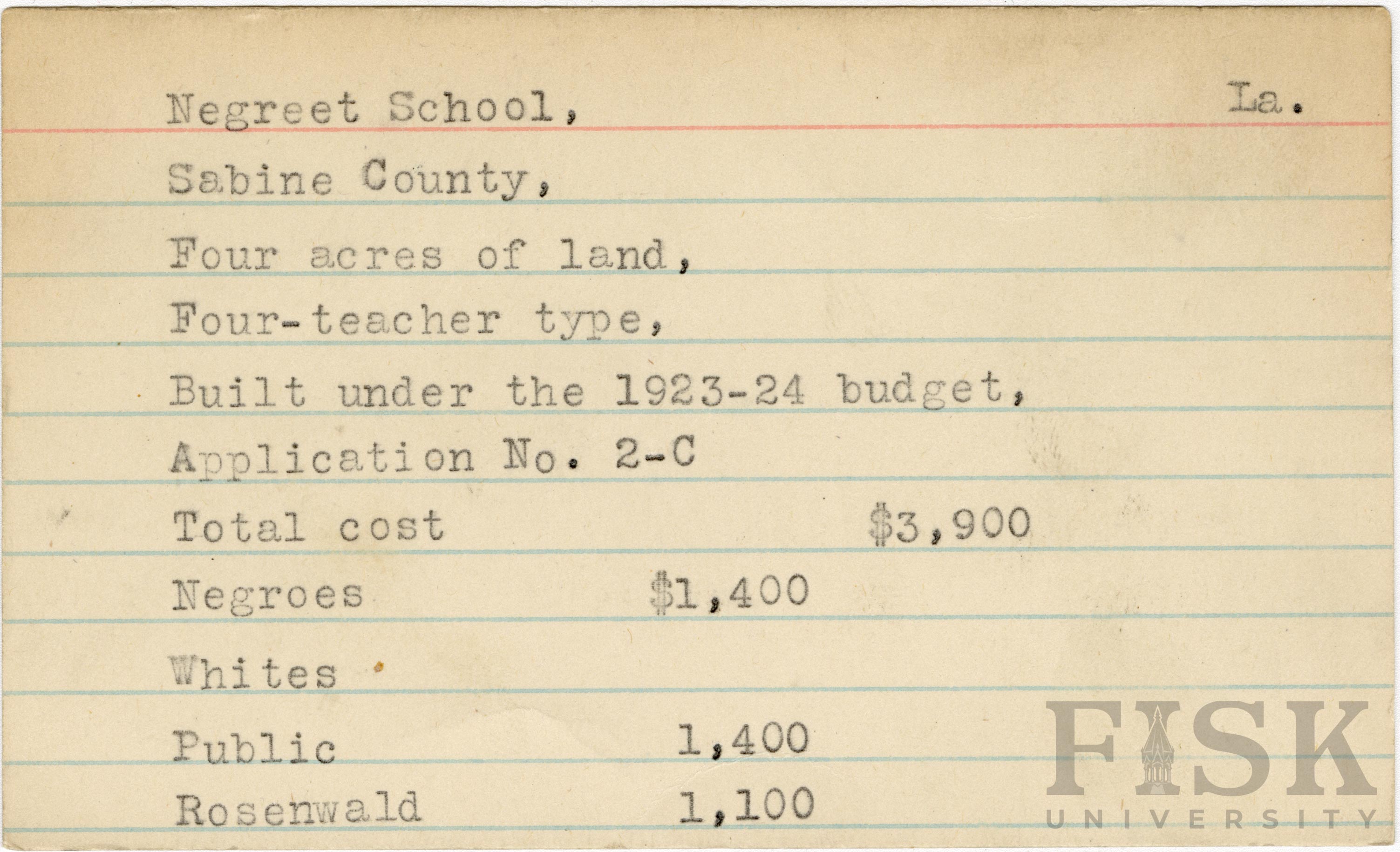 - School card from the Rosenwald Fund for Negreet School in Sabine County, Louisiana