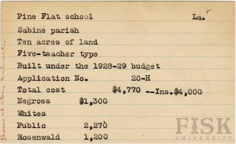 - School card from the Rosenwald Fund for Pine Flat School in Sabine Parish, Louisiana with a section added to the budget contributions that says, "Ins. $4,000". A handwritten note on the far left of the card says, "home at this school".