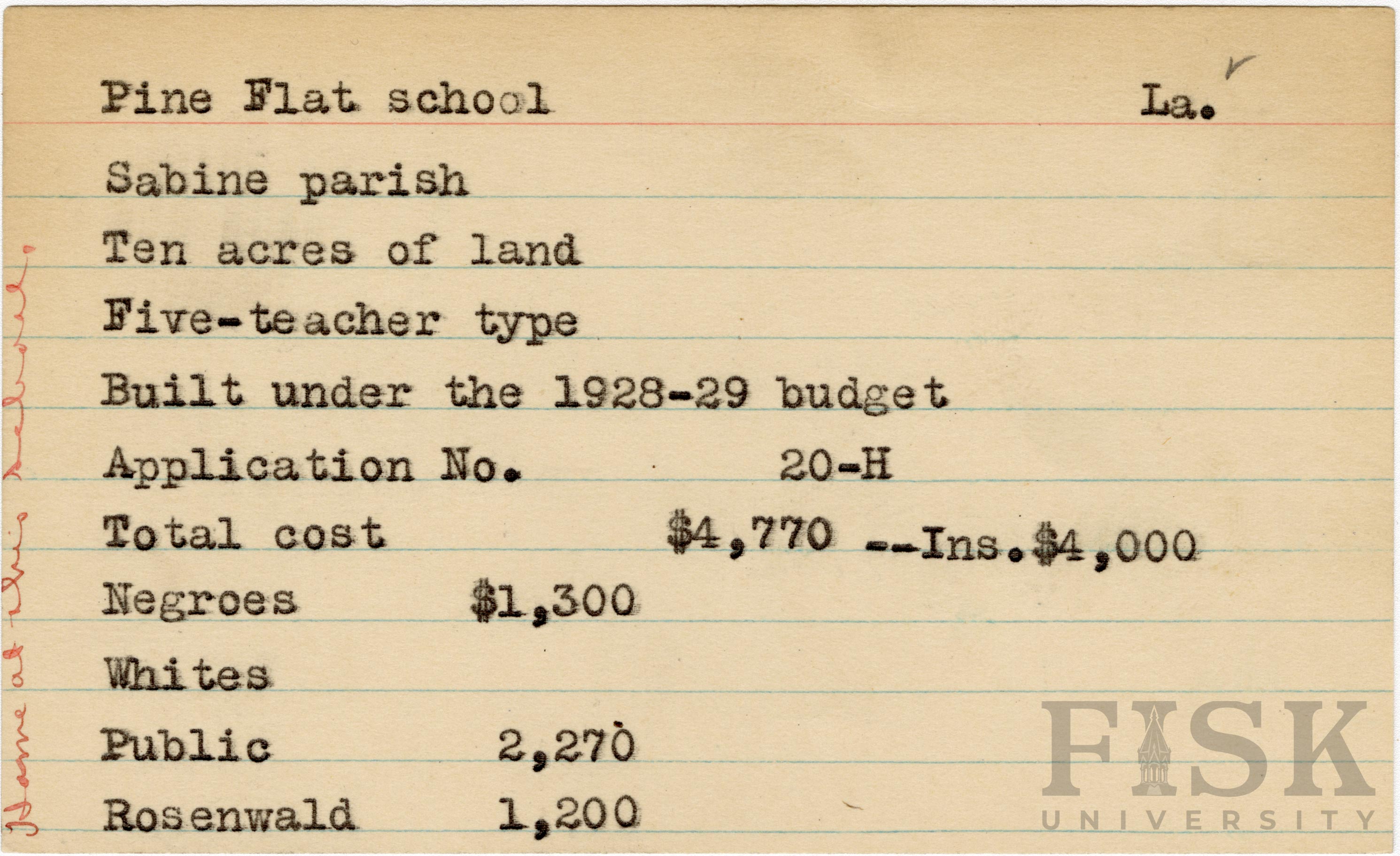 School card from the Rosenwald Fund for Pine Flat School in Sabine Parish, Louisiana with a section added to the budget contributions that says, "Ins. $4,000". A handwritten note on the far left of the card says, "home at this school".