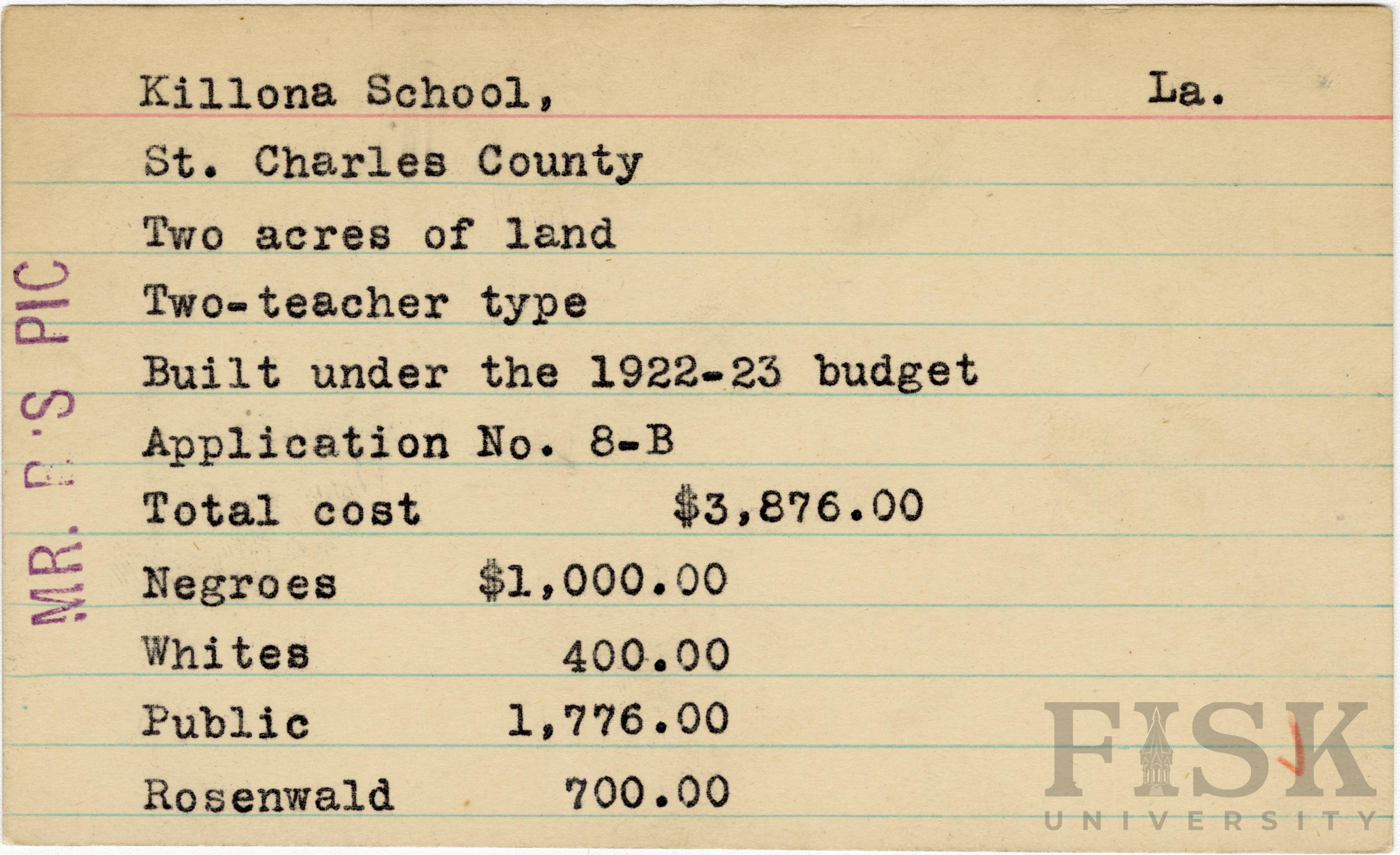 - School card from the Rosenwald Fund for Killo School in St Charles Parish, Louisiana with a note on the far left of the card that says, "Mr. R's Pic"