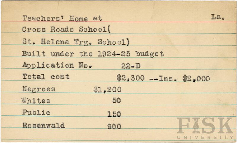 - School card from the Rosenwald Fund for the teacher's home at Cross Roads School in St. Hele Parish, Louisiana with a section added to the budget contributions that says, "Ins. $2,000"