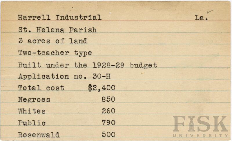 - School card from the Rosenwald Fund for Harrell Industrial School in St. Hele Parish, Louisiana