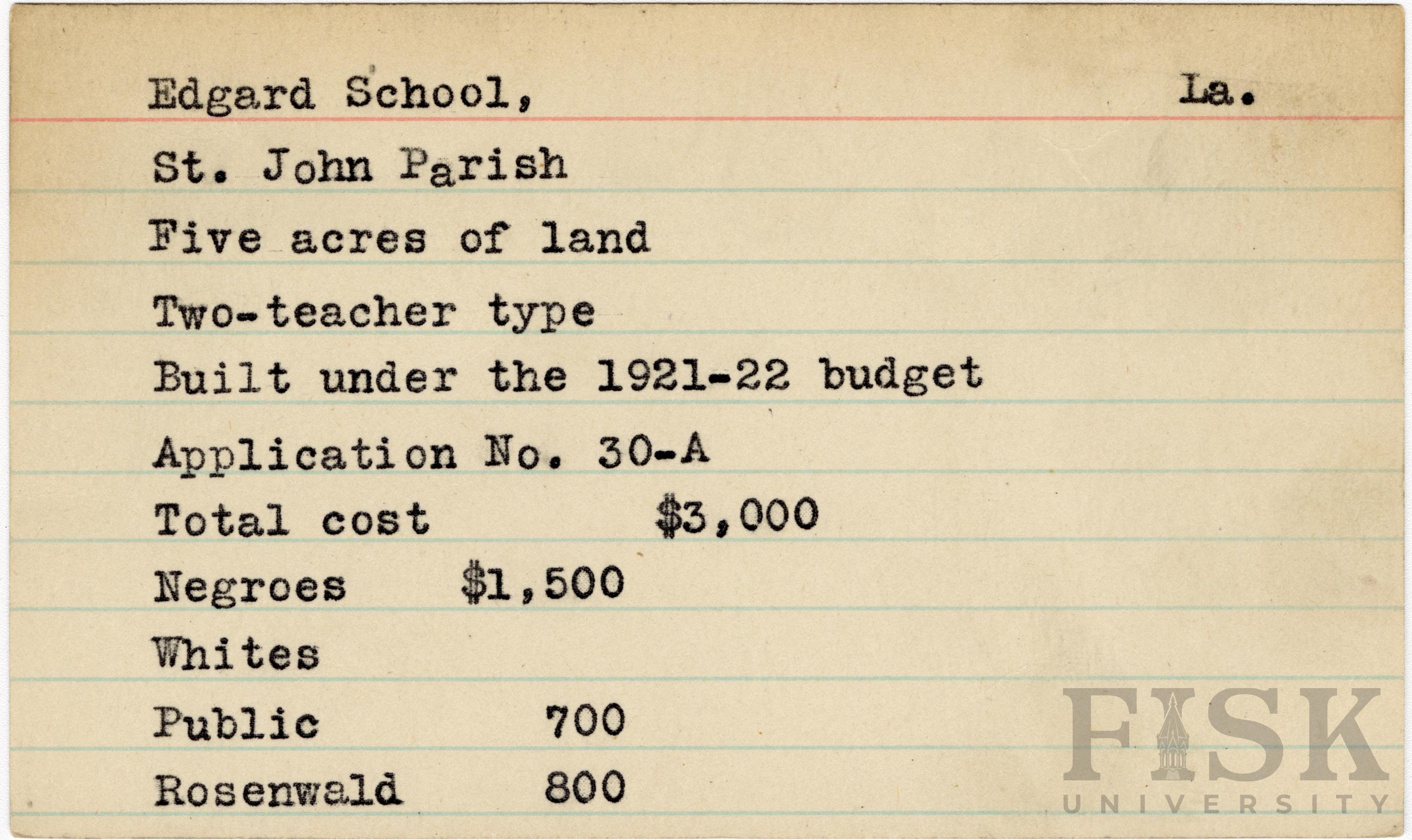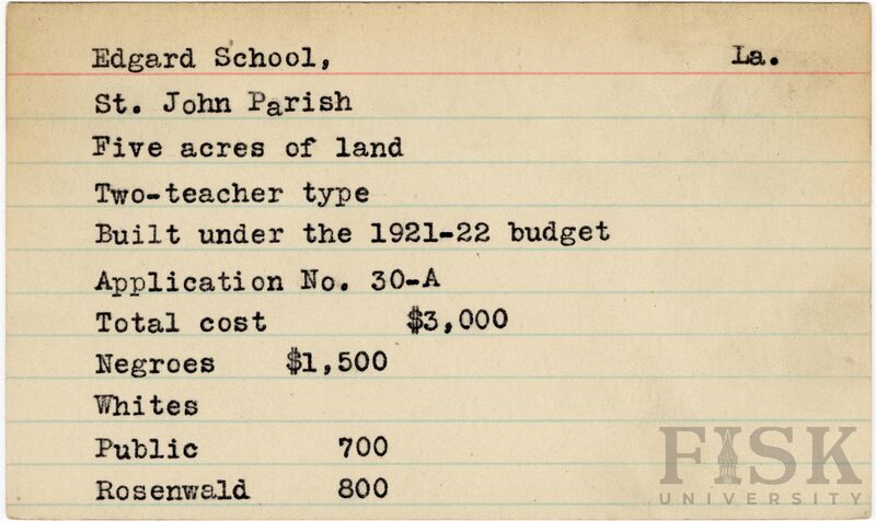 - School card from the Rosenwald Fund for Edgard School in St. John Parish, Louisiana