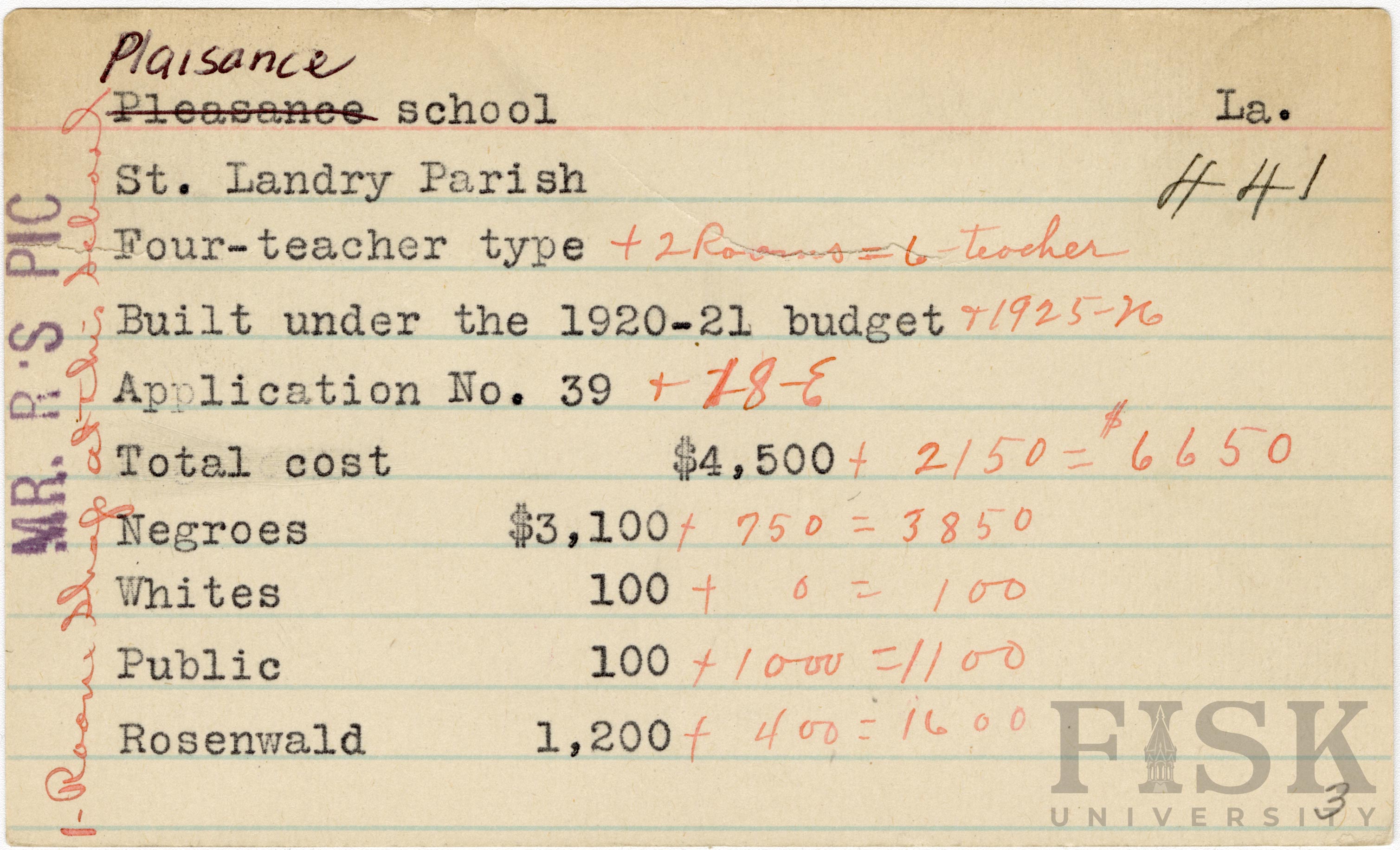 - School card from the Rosenwald Fund for Plaisance School in St. Landry Parish, Louisiana with handwritten additions to the teacher type, budget year, application number, and budget contribution sections. Notes on the far left of the card say, "Mr. R's Pic" and "1 Room shop at this school"