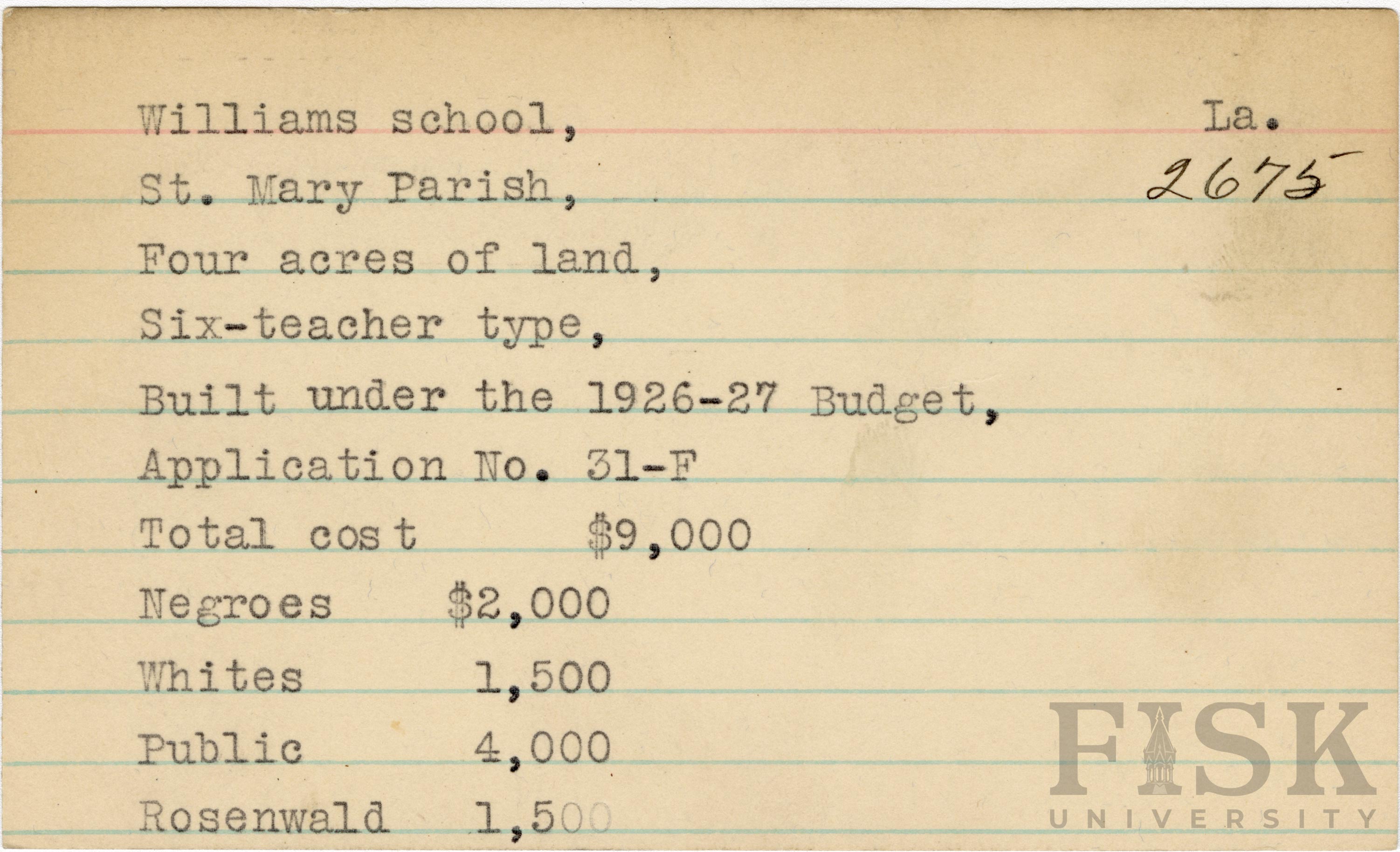- School card from the Rosenwald Fund for Williams School in St. Mary Parish, Louisiana