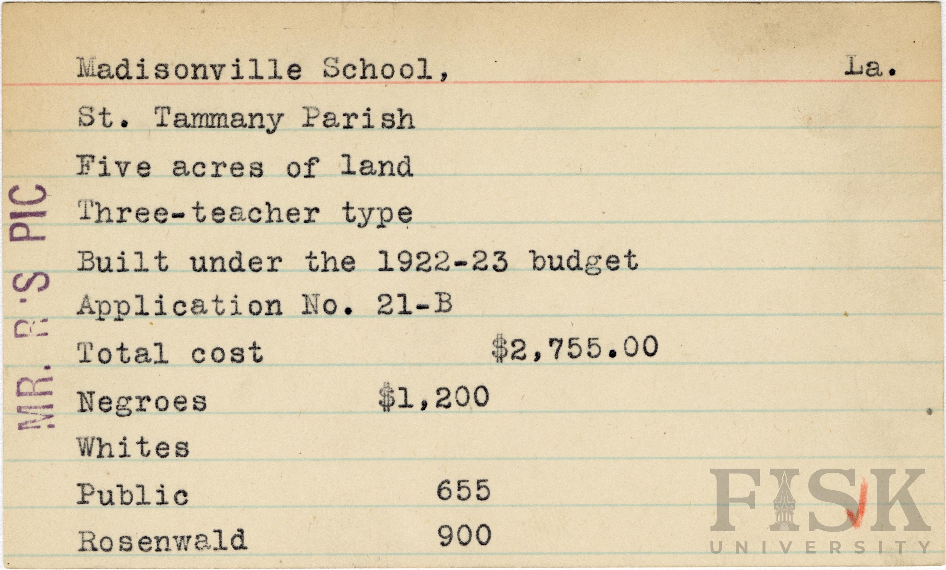 - School card from the Rosenwald Fund for Madisonville School in St. Tammany Parish, Louisiana with a note on the far left of the card that says, "Mr. R's Pic"