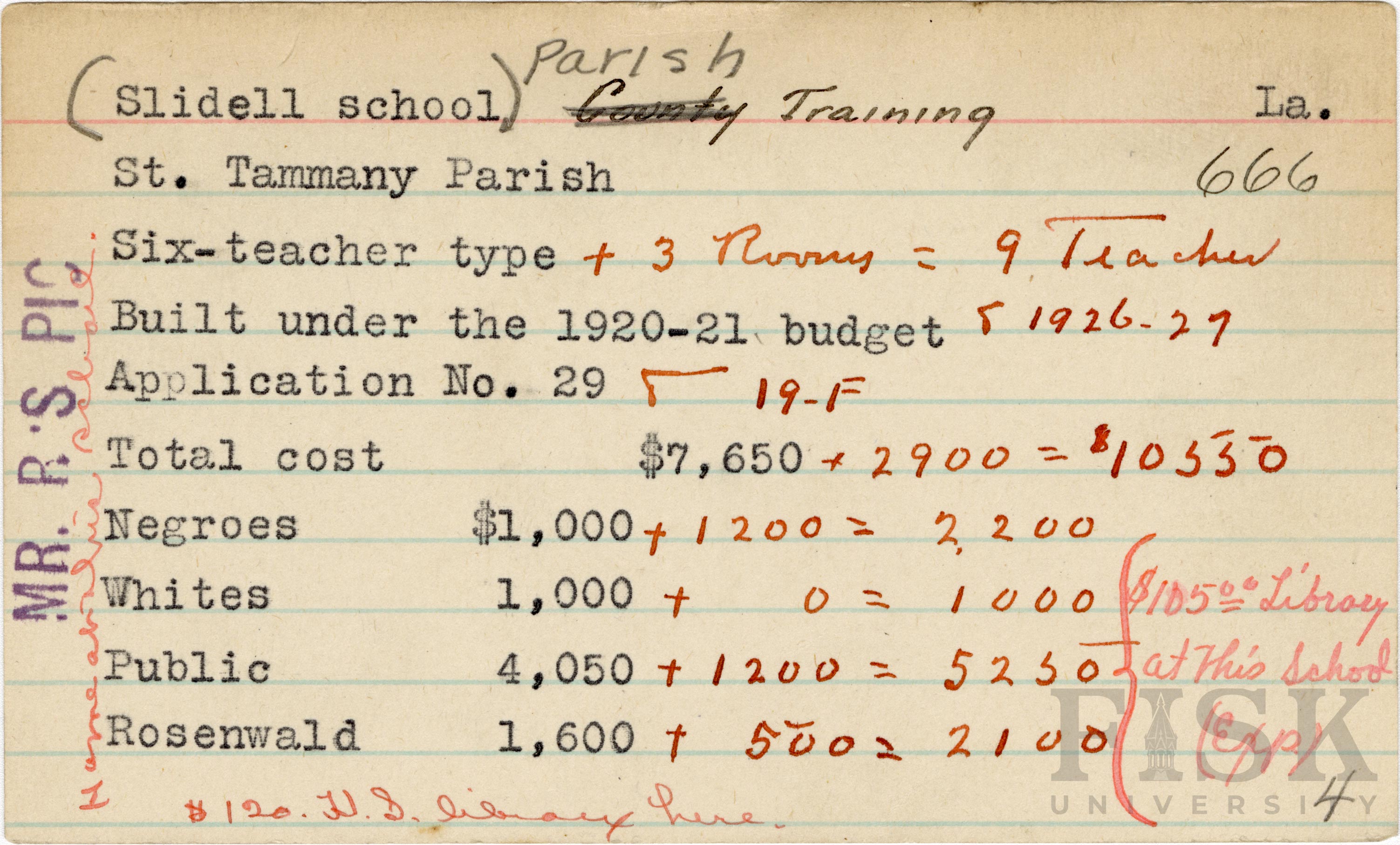 - School card from the Rosenwald Fund for Slidell School in St. Tammany Parish, Louisiana with handwritten additions to the teacher type, budget year, application number, and budget contribution sections. Handwritten notes on the card say, "Mr. R's Pic," "Home at this school," "$120 H.S. library here," "$105.00 at this school (Exp)"