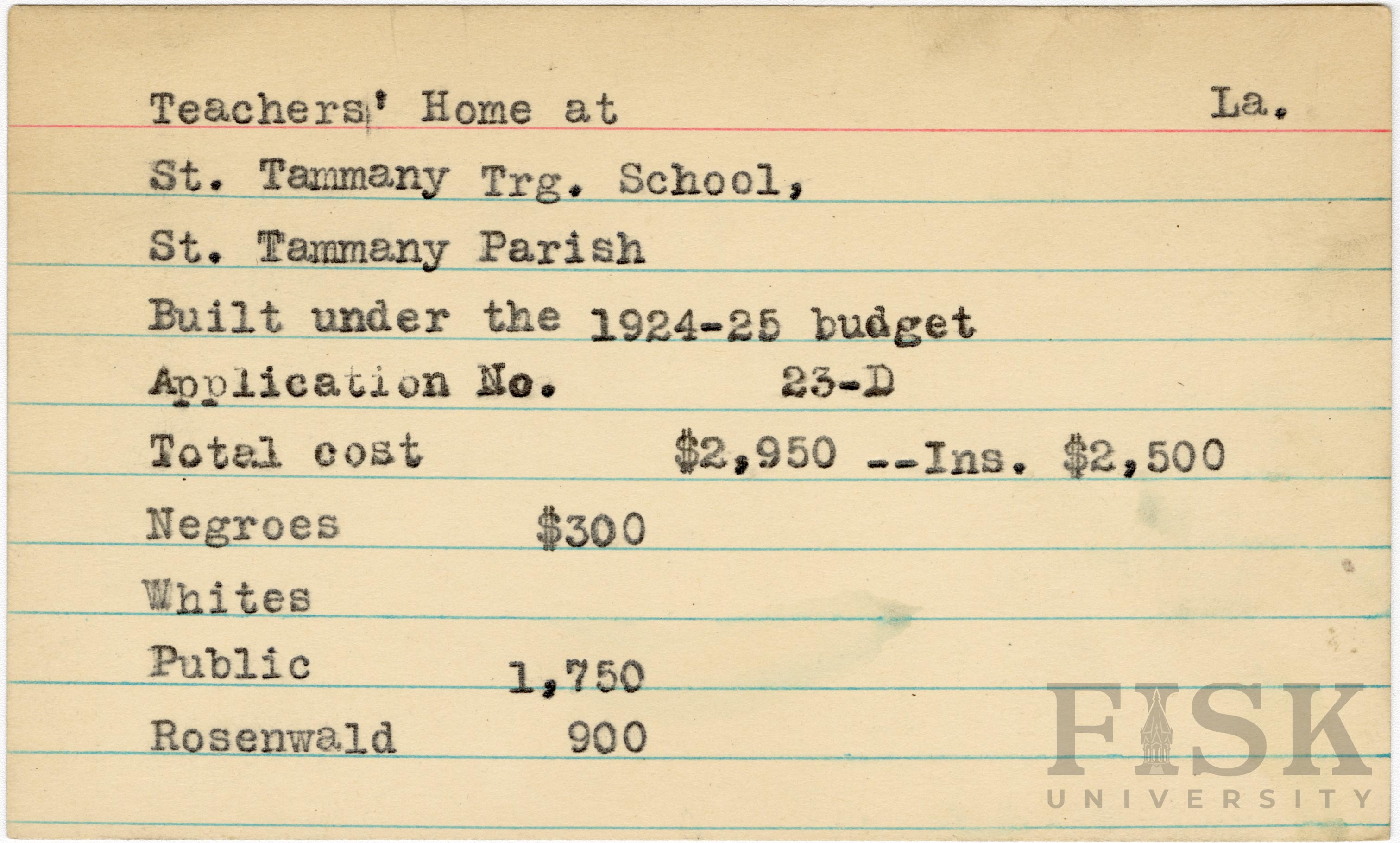- School card from the Rosenwald Fund for the teacher's home at Slidell School in St. Tammany Parish, Louisiana with a secton added to the budget contributions that say, "Ins. $2,500"