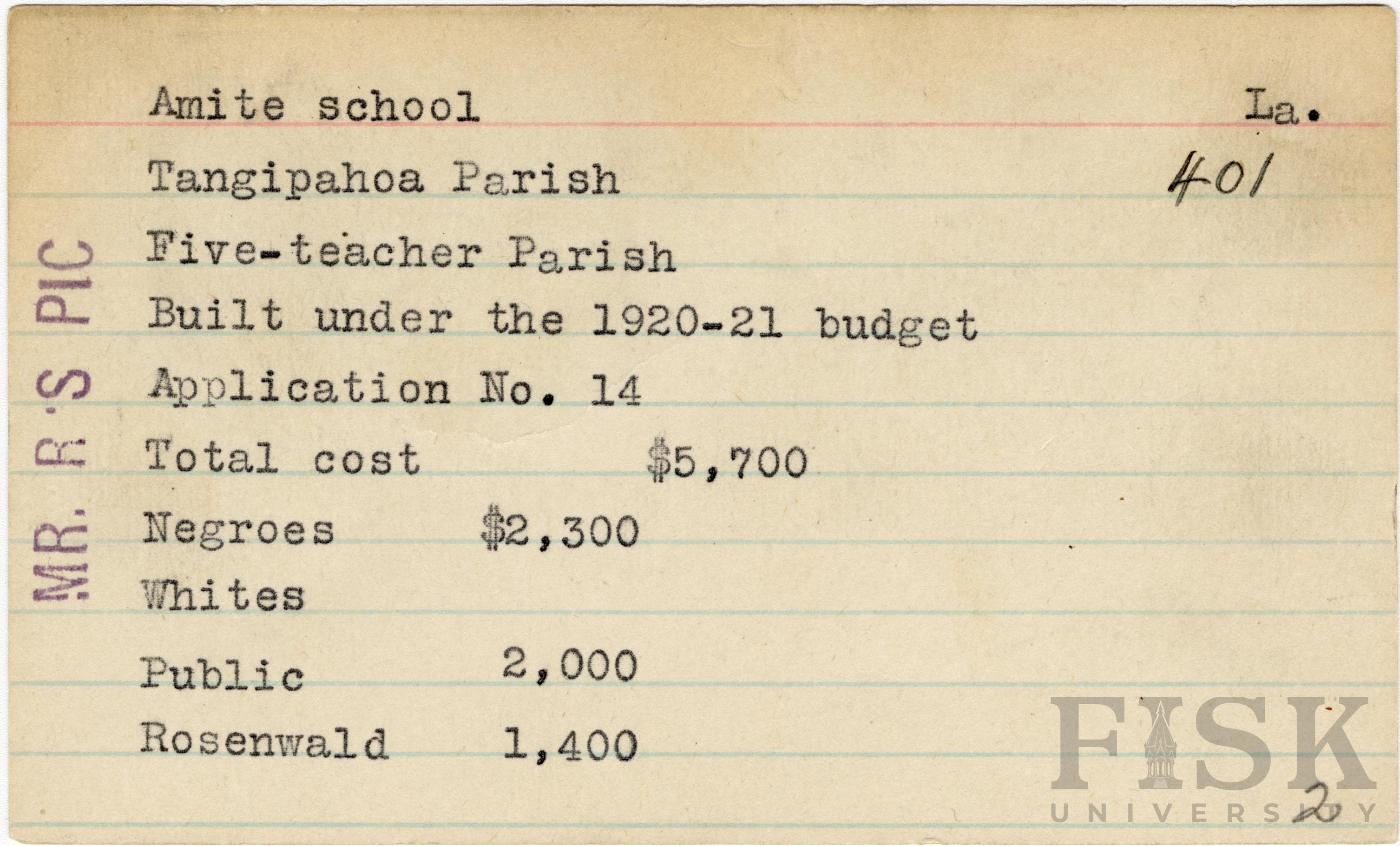 - School card from the Rosenwald Fund for Amite School in Tangipahoa Parish, Louisiana with a note on the far left of the card that says, "Mr. R's Pic"